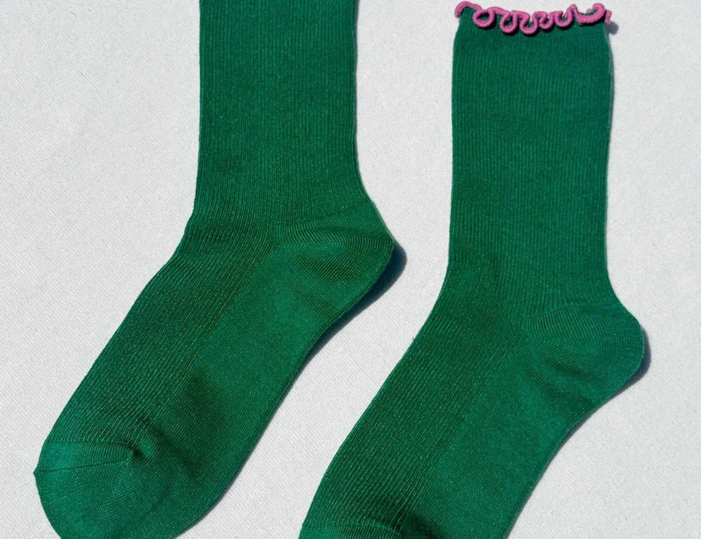 Le Bon Shoppe - Ruffled Modal Socks: SPINACH / PINK EDGE