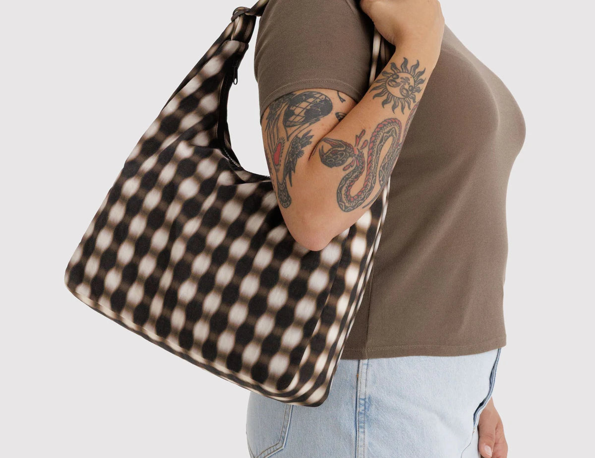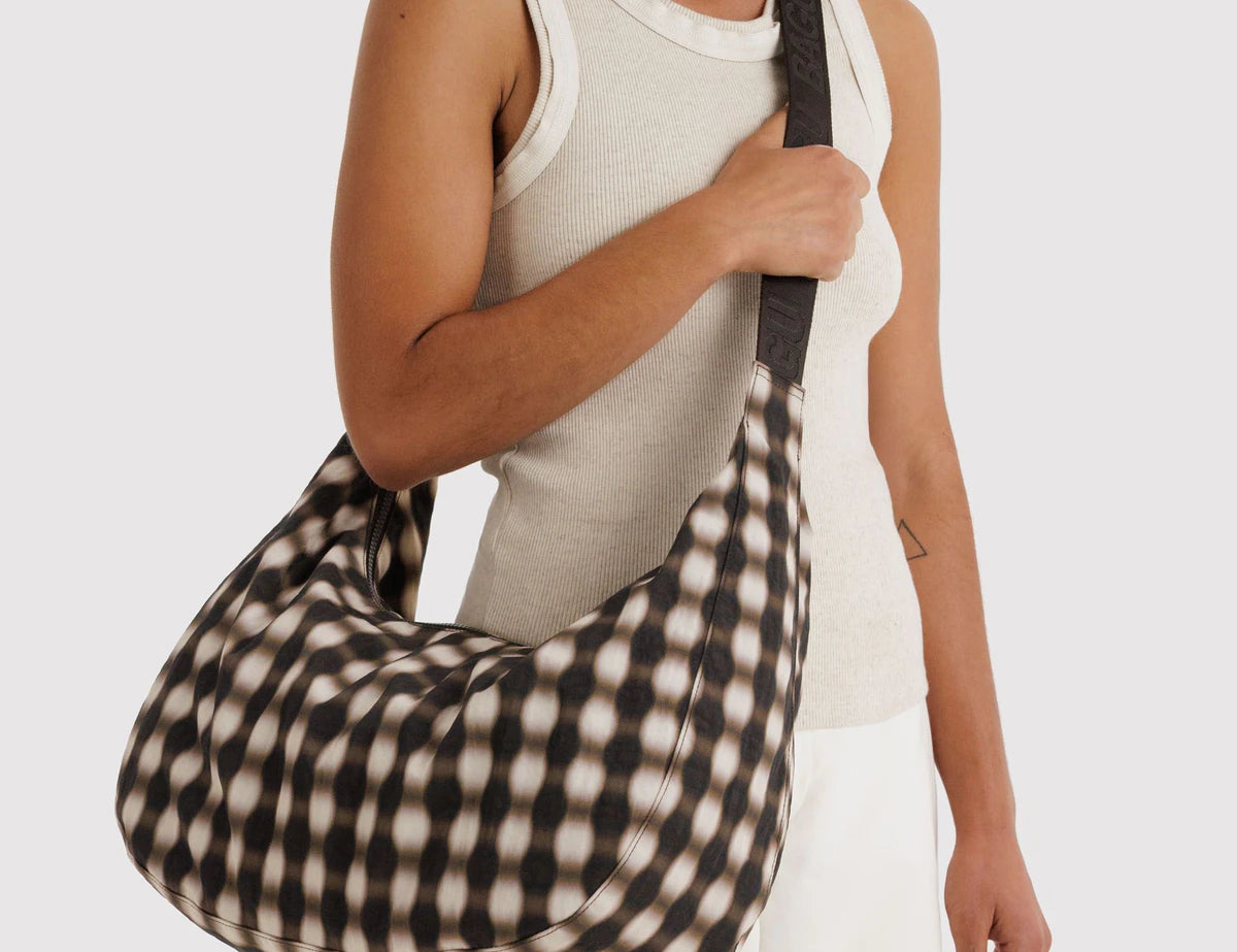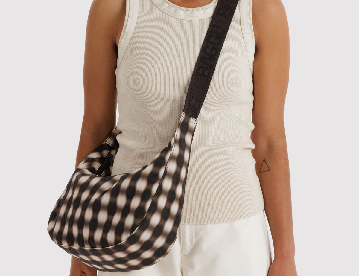 Large Nylon Crescent Bag - Blurred Gingham Brown | BAGGU