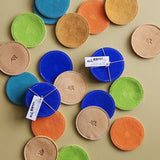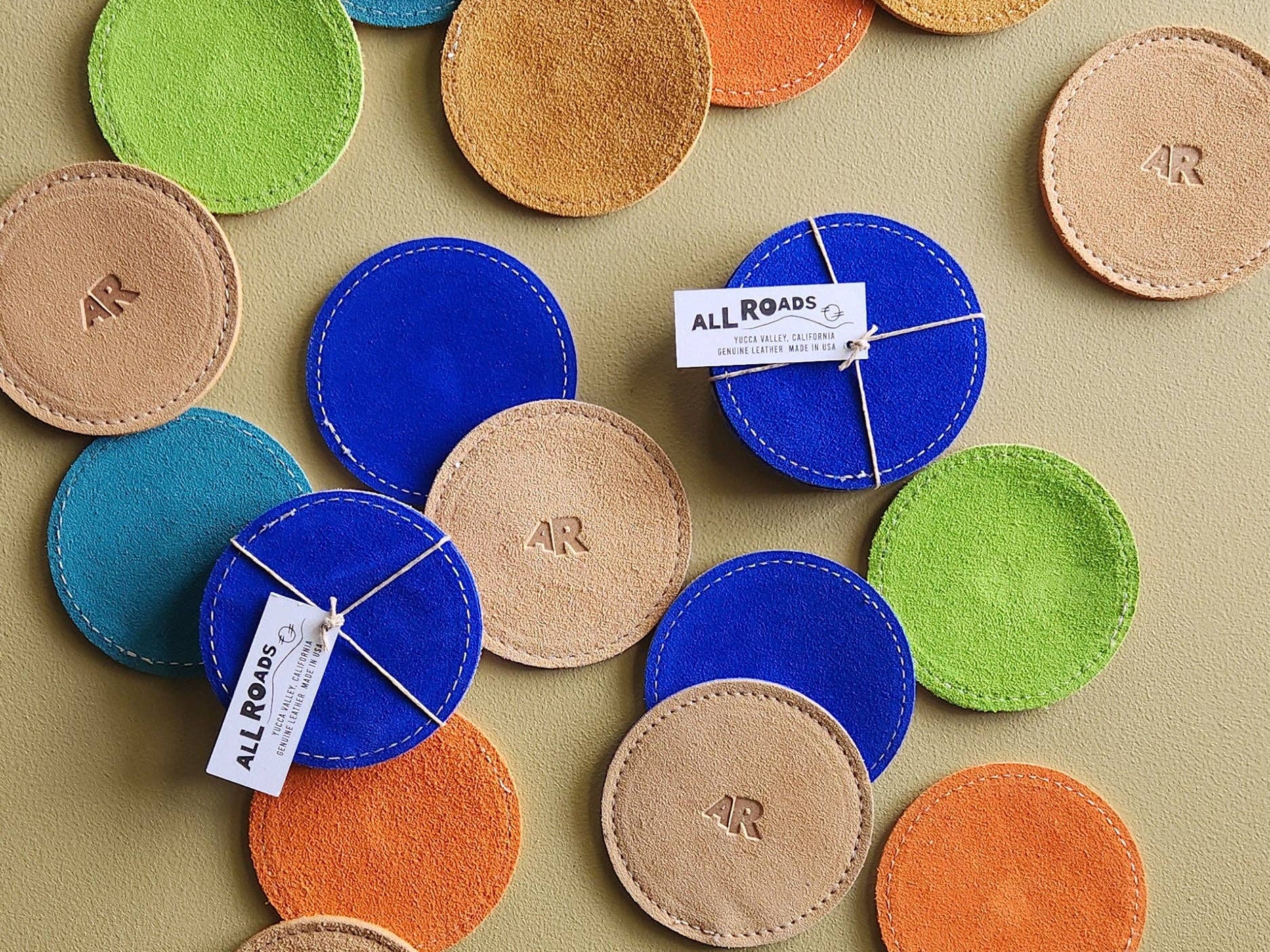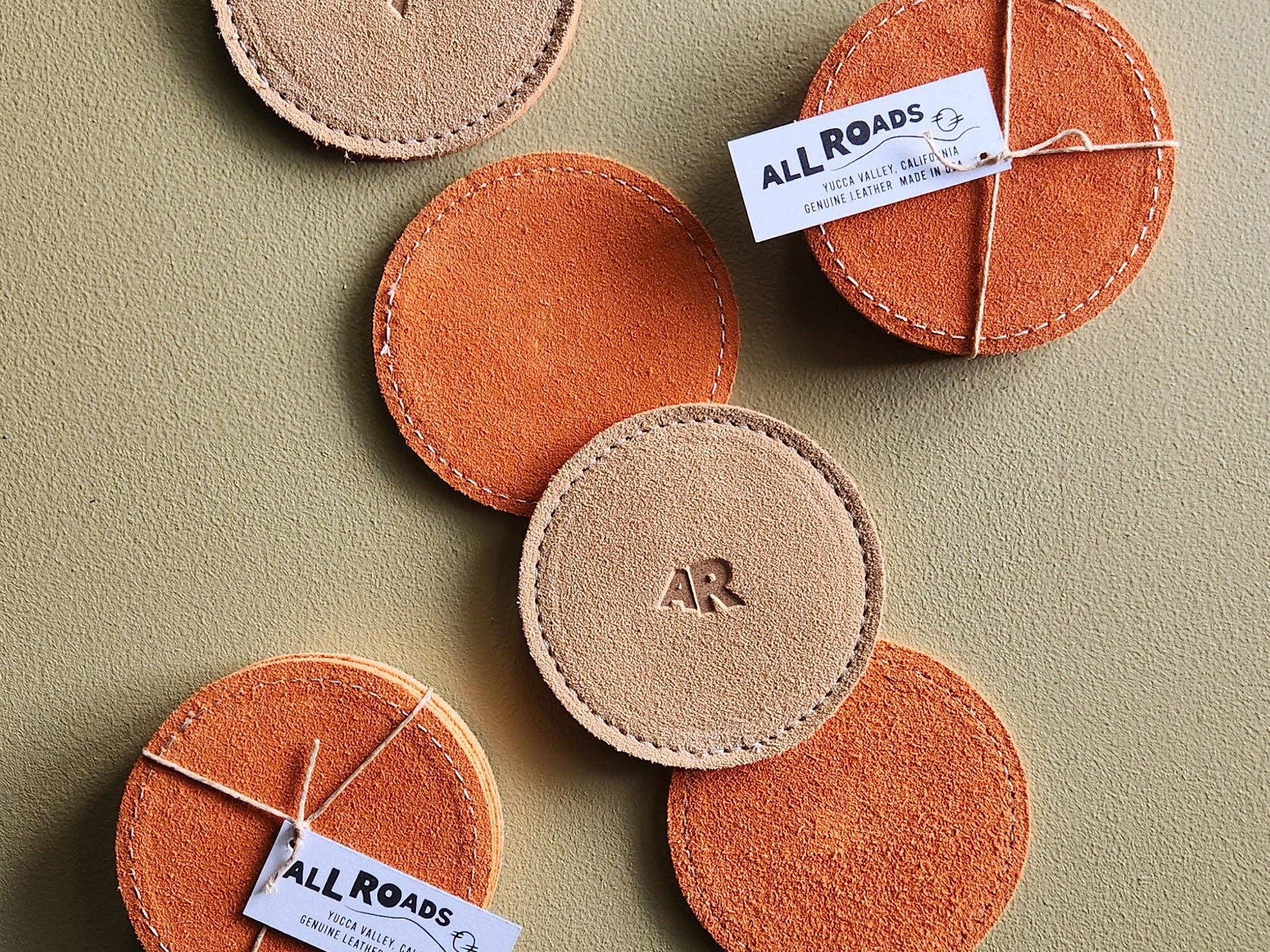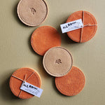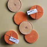 Double-sided suede coasters. One side of the coaster is Toast, the other side is light tan suede. Set of 4. 4" round.