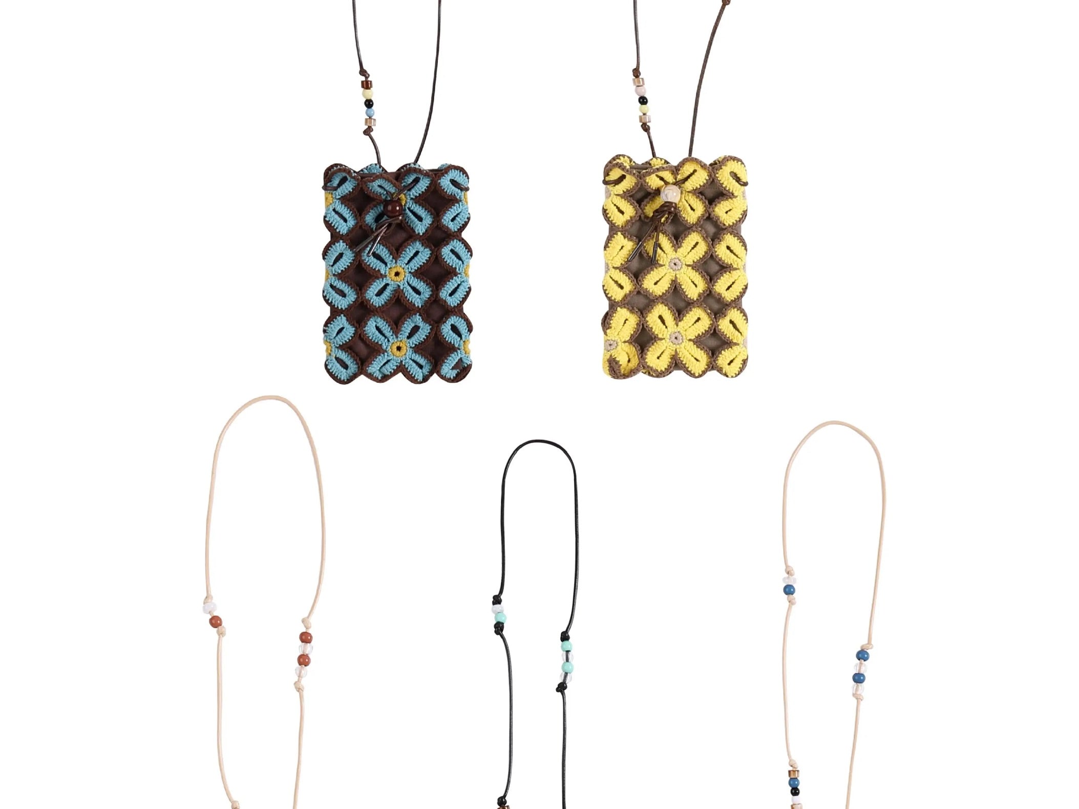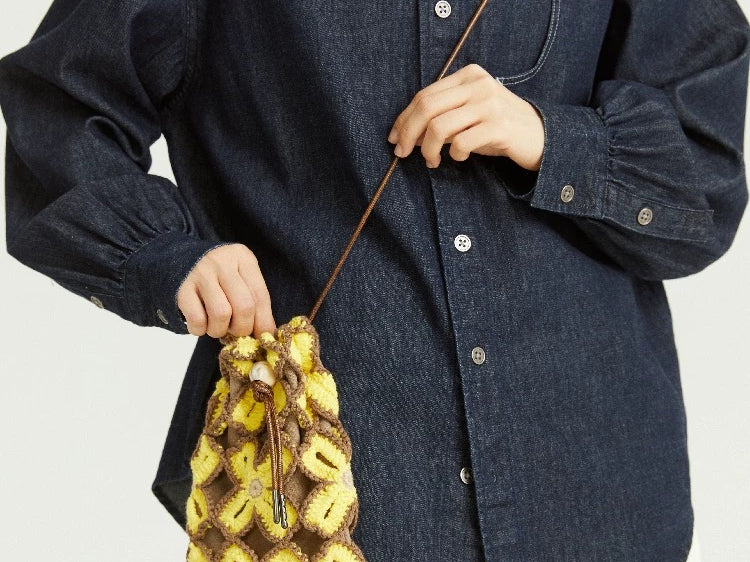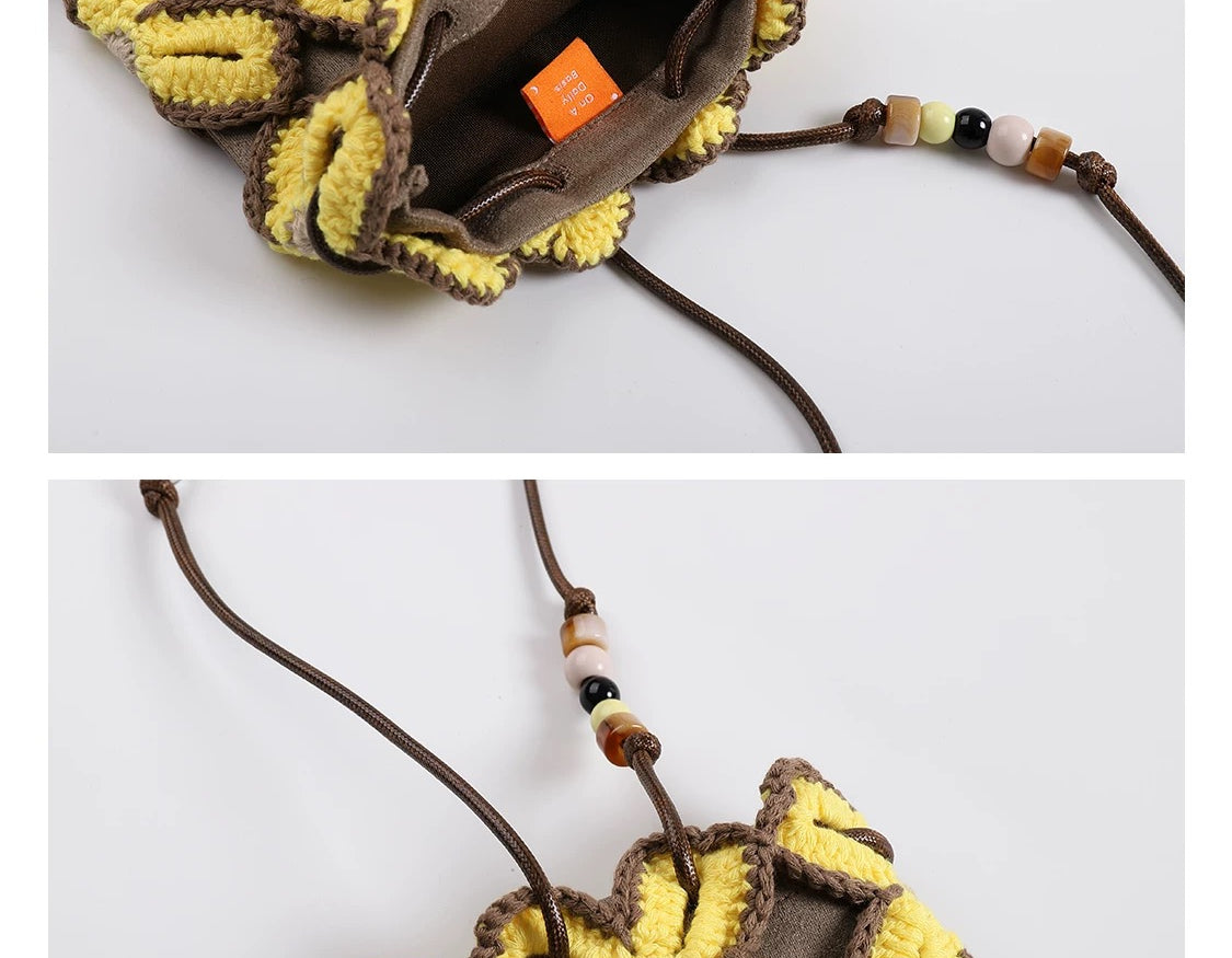 A lightweight crossbody pouch featuring hand-crocheted flower motifs, a soft inner lining, and a beaded drawstring strap. A sweet and practical accessory for carrying your everyday essentials.