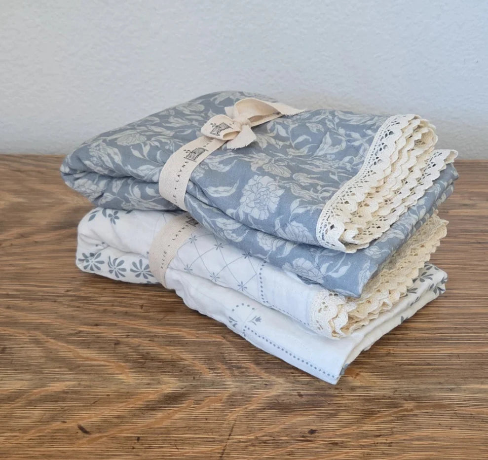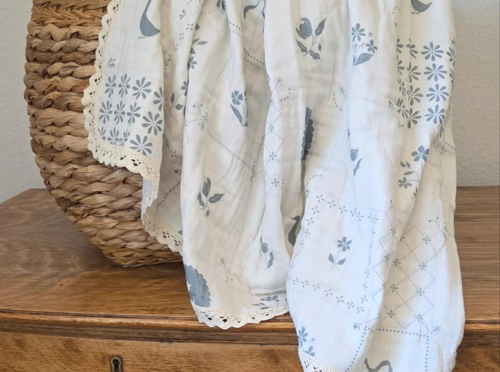 These beautiful blankets are made of a soft 6 layer gauze and feature a lace trim. They measure 45 x 45in giving your little ones a lot of room to grow with their new blankets. Perfect from birth, toddlerhood and beyond. They also make a great lap blanket for you too!