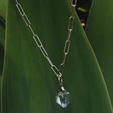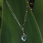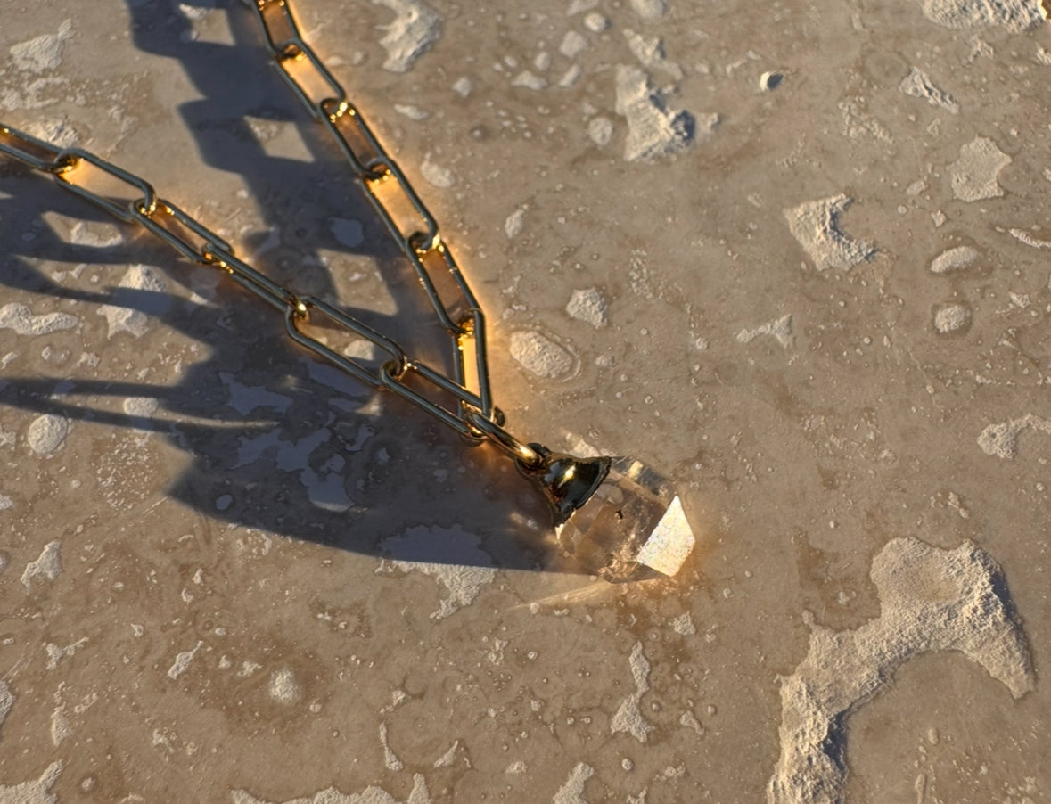 Natural Herkimer Diamond with gold electroplated cap. The 17” Chain is 24K gold Vermeil, connectors and rings are also 24K gold vermeil as well as the clasp.