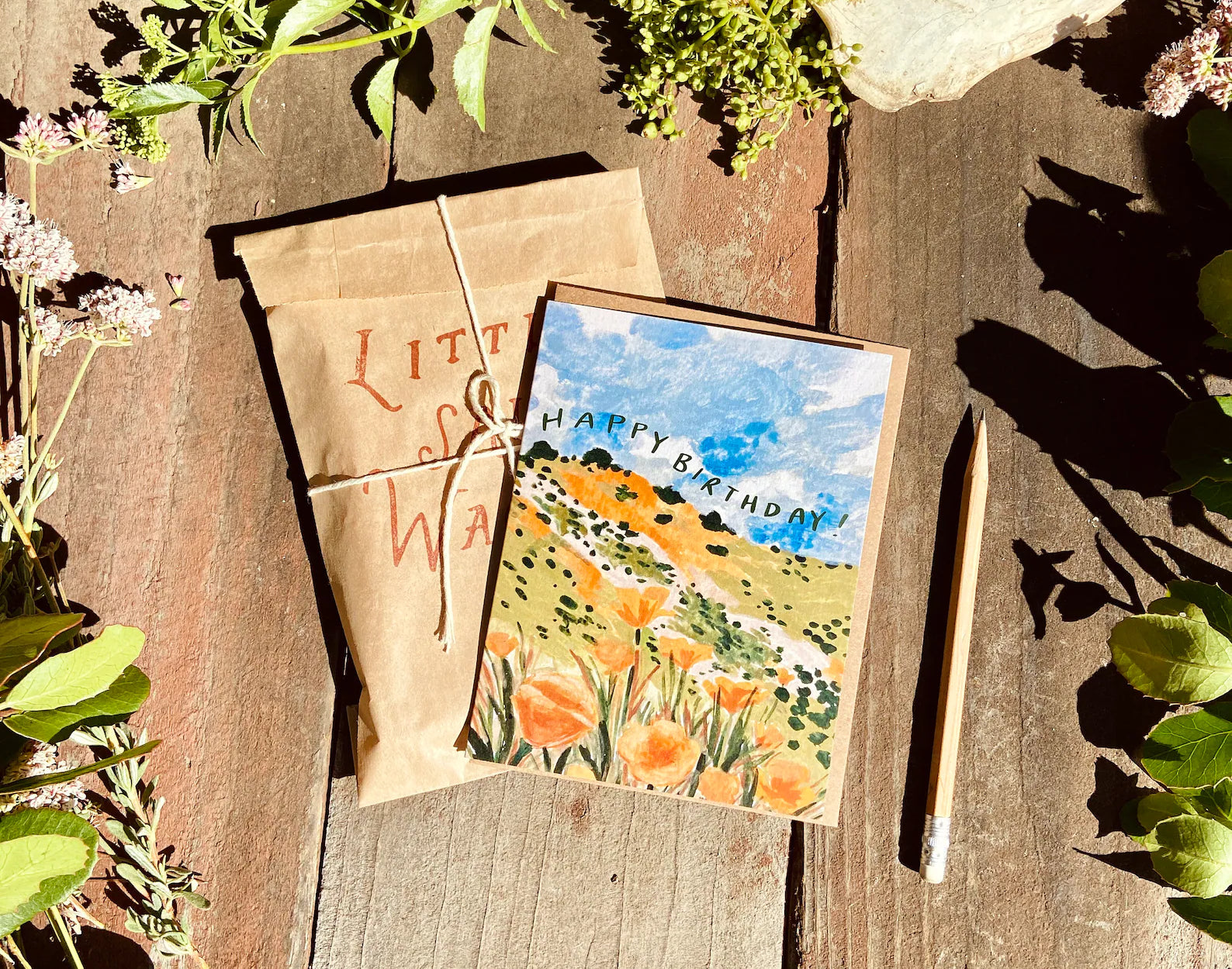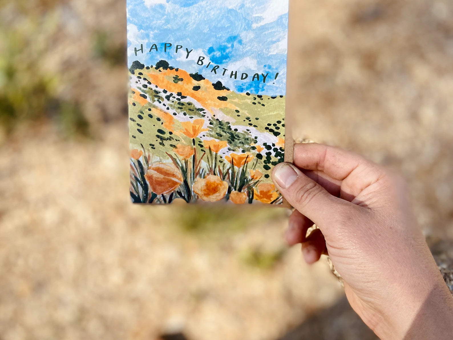 Inspired by the rural landscapes of Central California and the Golden Poppy super blooms in Spring here, this card is sure to be a winner for any wildflower or nature lover of yours or for a special someone's golden birthday. Works as a perfect finishing touch to a birthday gift for a fellow Californian, sun-soaker, free spirit, or wild child.