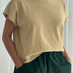 The Jeanne Tee is our perfect muscle tee. She features a shorter length to pair perfectly with high waisted bottoms but still give enough coverage for mid-rise bottoms and just the right amount of off shoulder dolman sleeve. She has a high crew neck with an extra wide neckband that adds to her signature charm.