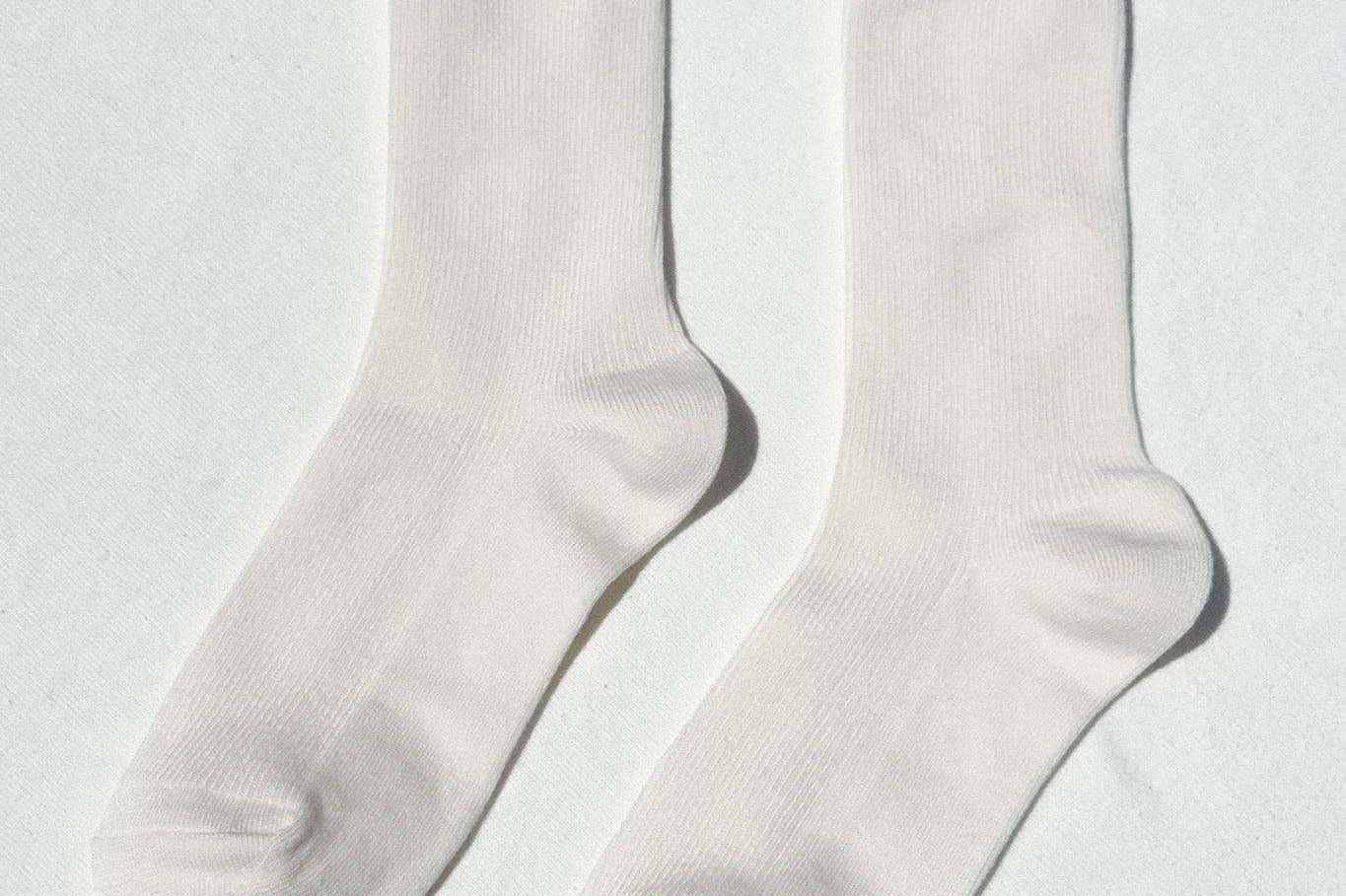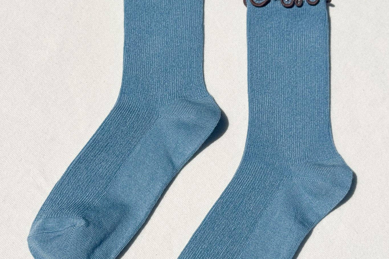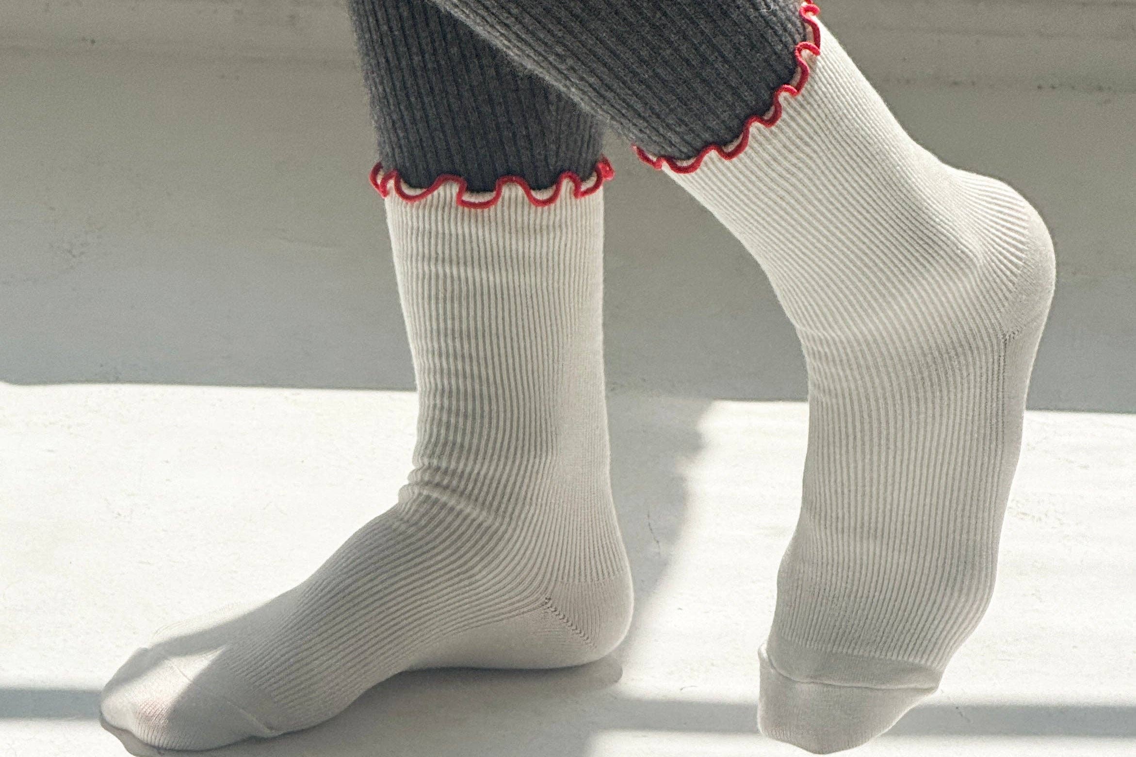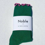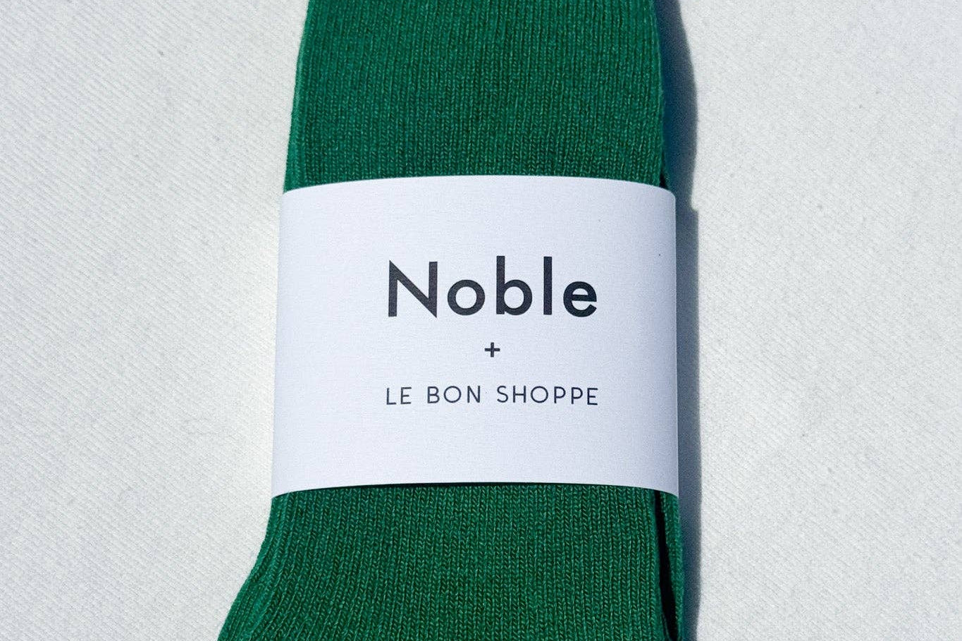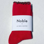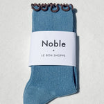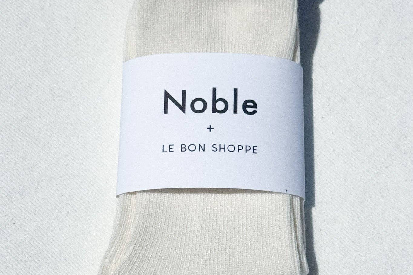 Why We Made This? Noble x Le Bon Shoppe — A sock born from our shared love of slow fashion, good design, and color combos that go with literally everything. The Ruffled Modal Socks feature a baby rib texture with a playful lettuce-edge ruffle at the top. Their versatile crew length makes them perfect worn long or scrunched down. Made in South Korea Contents: 80 modal 18 polyester 2 spandex Sizing: One size fits most (US women's size 6-10) Care Instructions: Machine wash cold Tumble dry low Do not iron Do not bleach