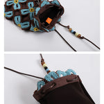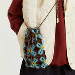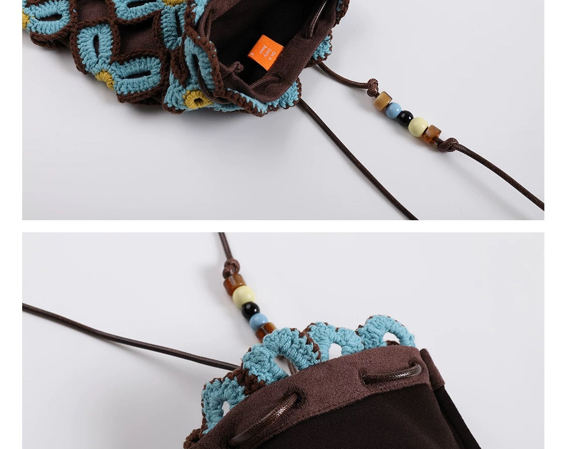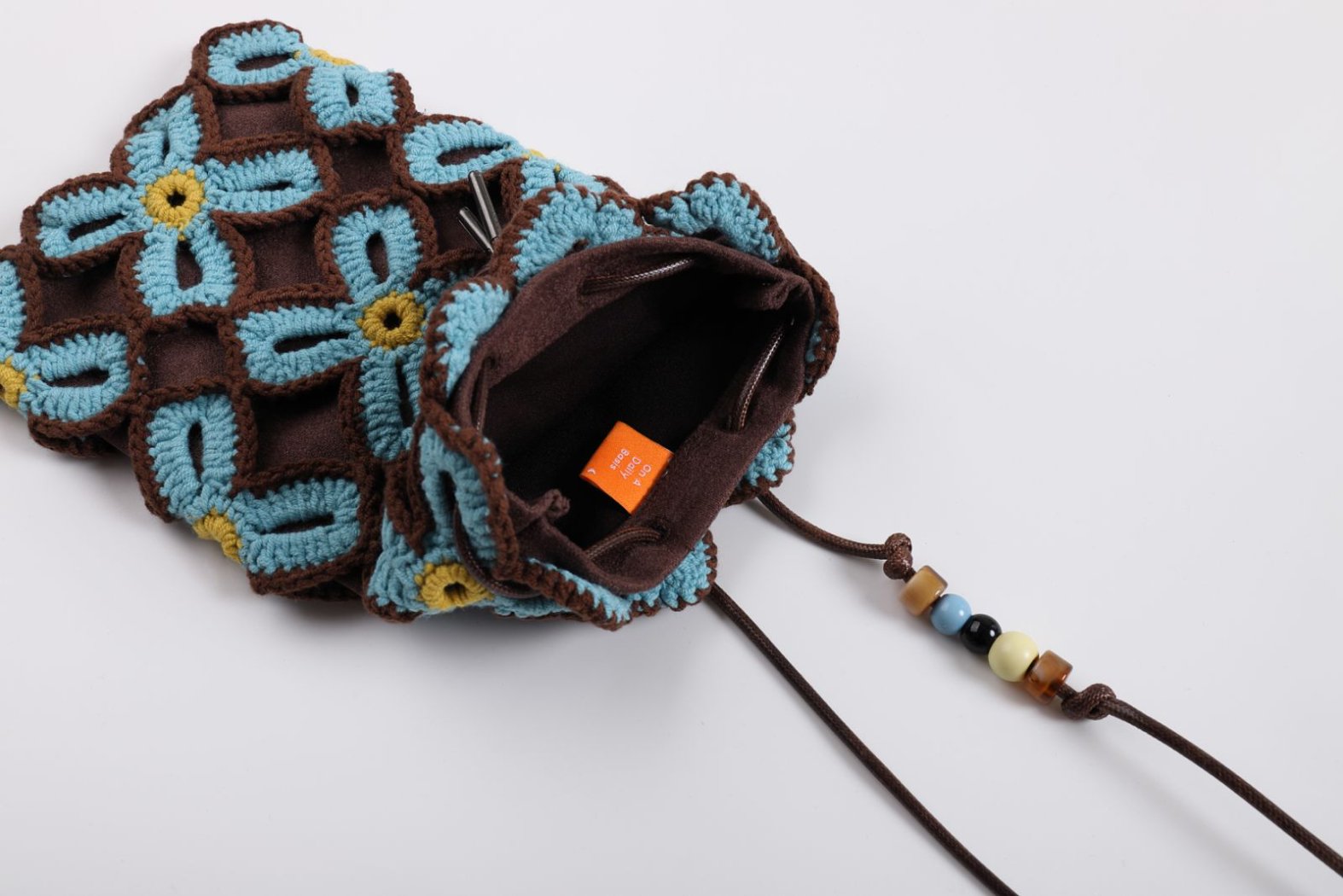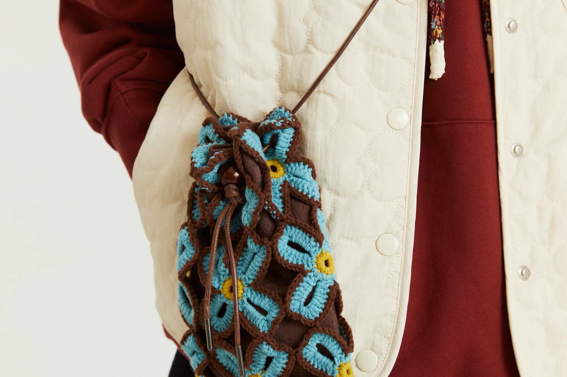 A lightweight crossbody pouch featuring hand-crocheted flower motifs, a soft inner lining, and a beaded drawstring strap. A sweet and practical accessory for carrying your everyday essentials.