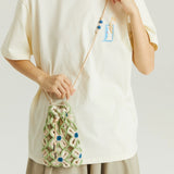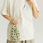 A lightweight crossbody pouch featuring hand-crocheted flower motifs, a soft inner lining, and a beaded drawstring strap. A sweet and practical accessory for carrying your everyday essentials.
