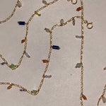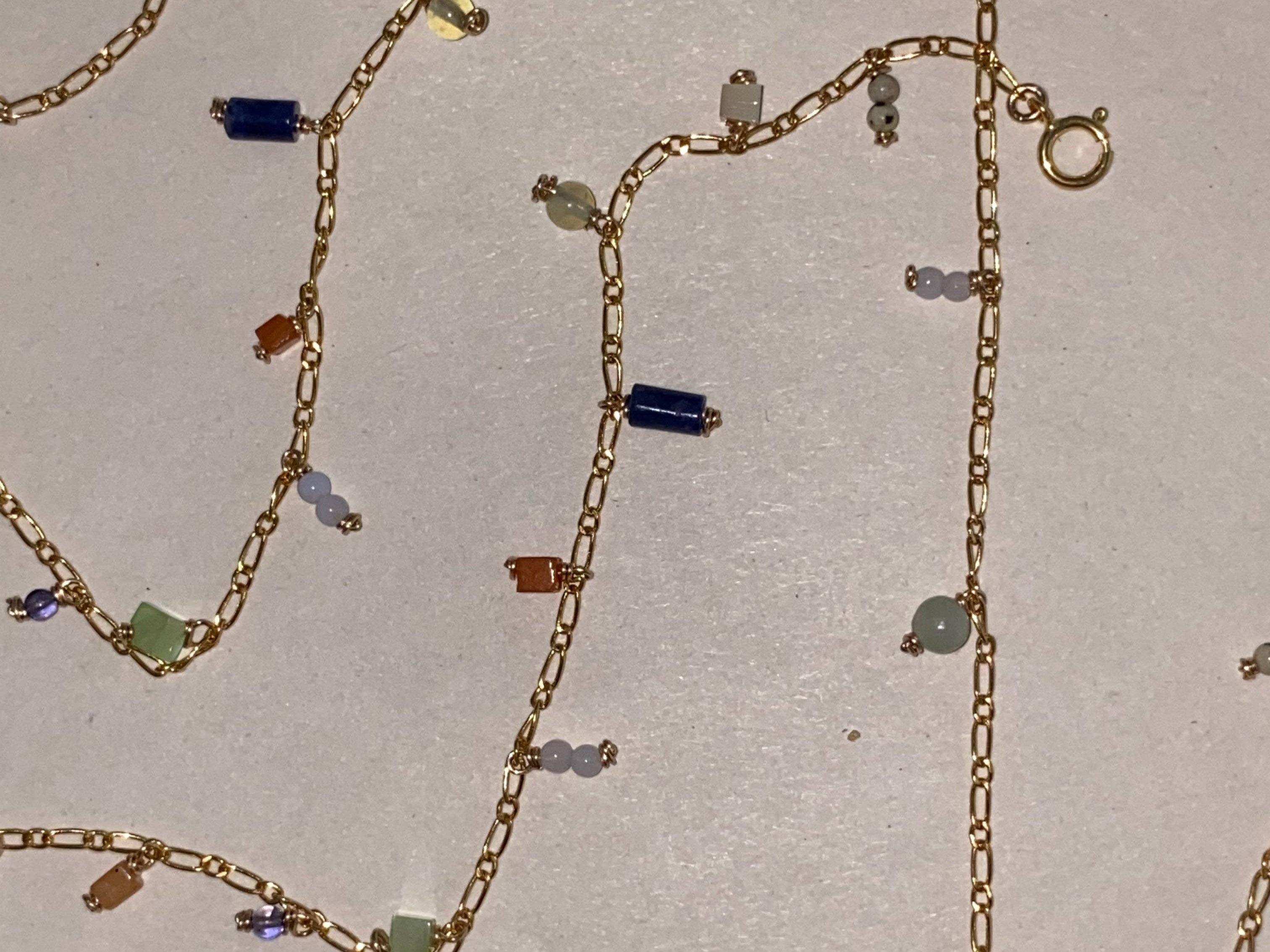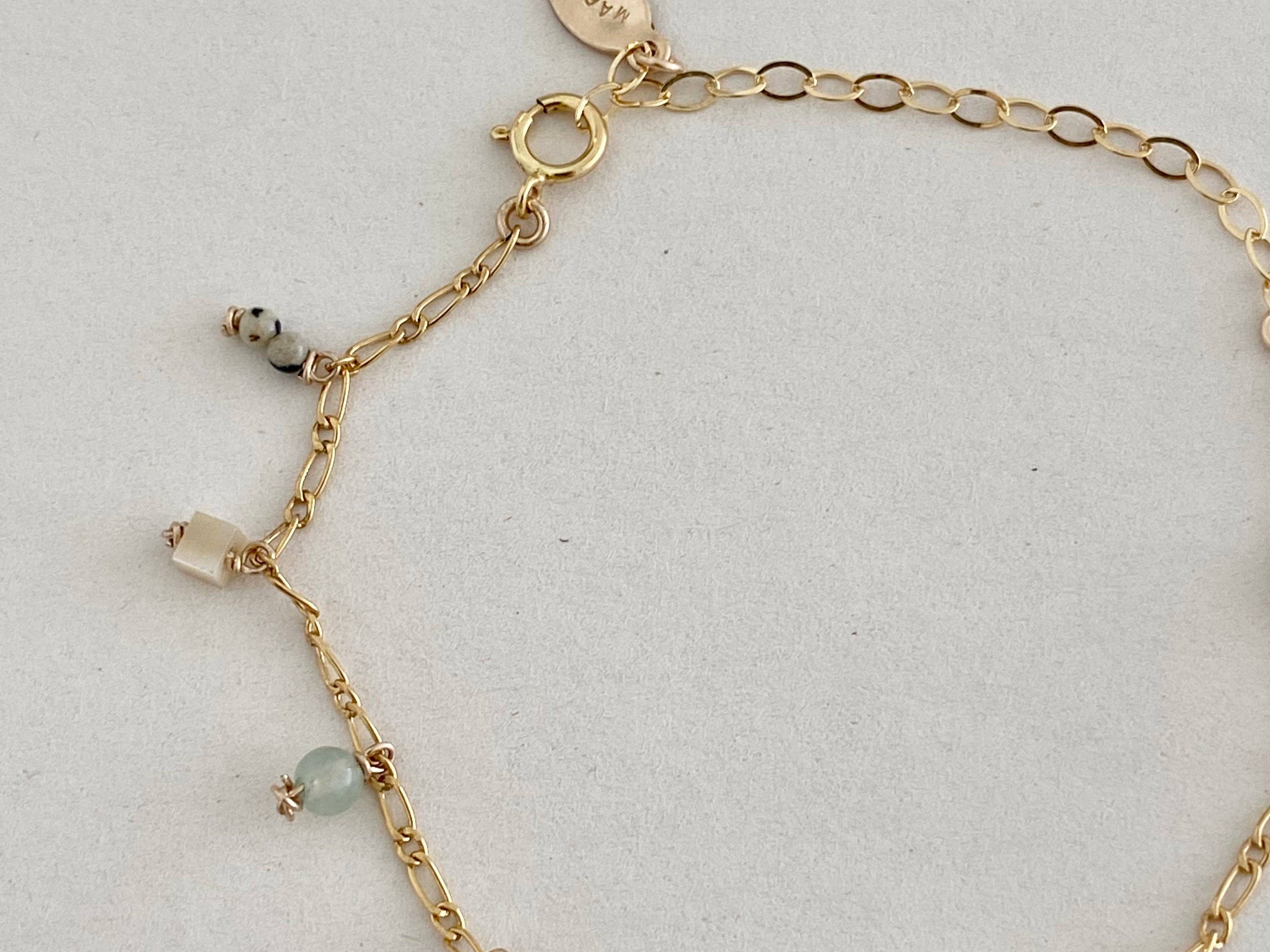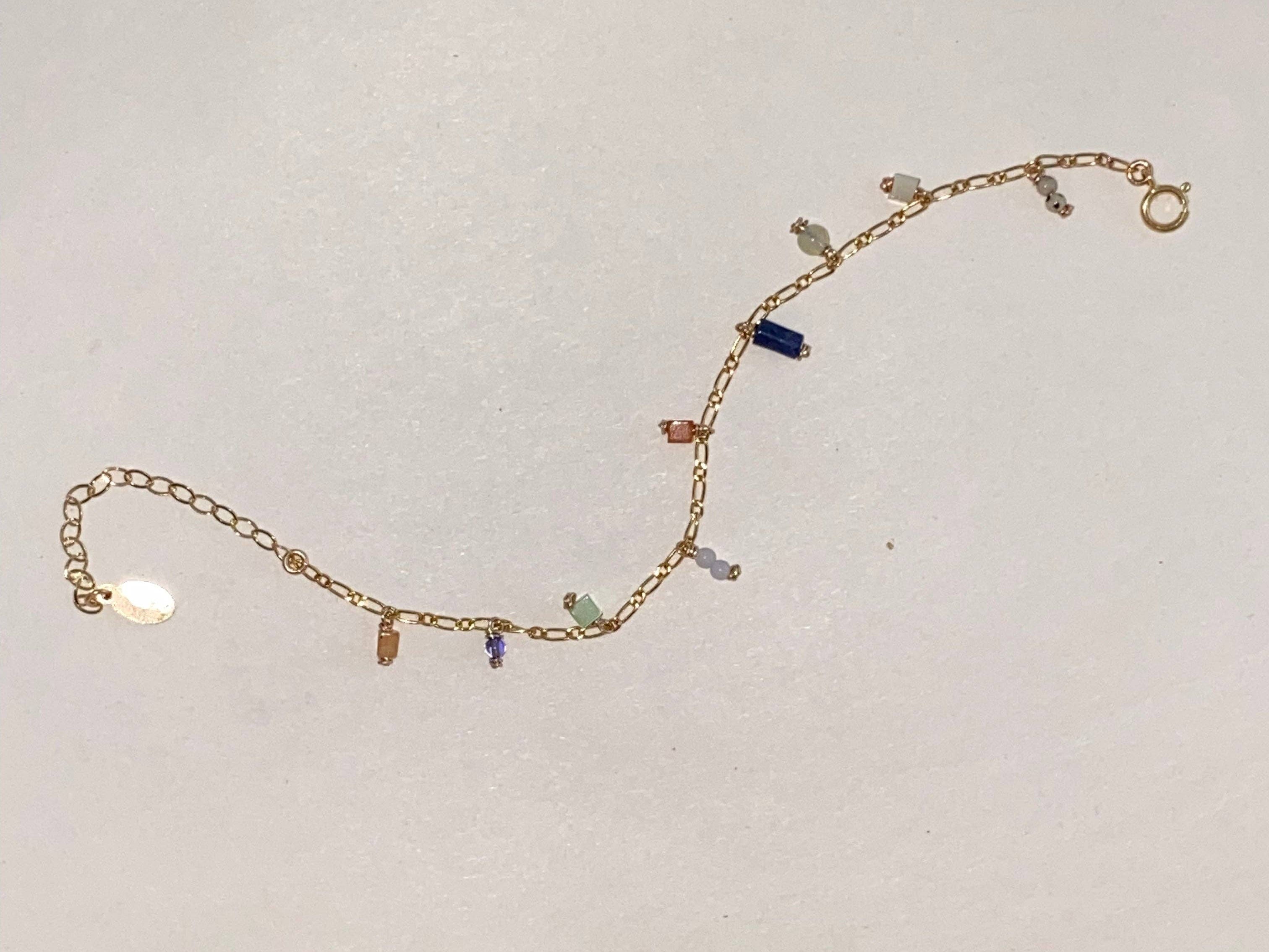 * This bracelet features gemstones of various colors on a delicate figaro chain. Gemstones include: Dalmatian Jasper, Blue Lace Agate, Sodalite, Prehnite, Red Aventurine, mother of pearl, and synthetic cat-eye.
