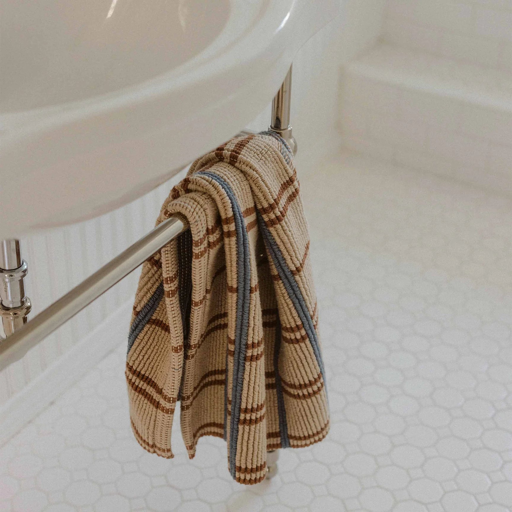 A Morrow best-seller, the Lucia features a smooth surface created by small tight loops. This classic check pattern is now offered in a beautiful Azul and Tan colorway on a soft natural background. We love this washable rug for kitchens and bathrooms.