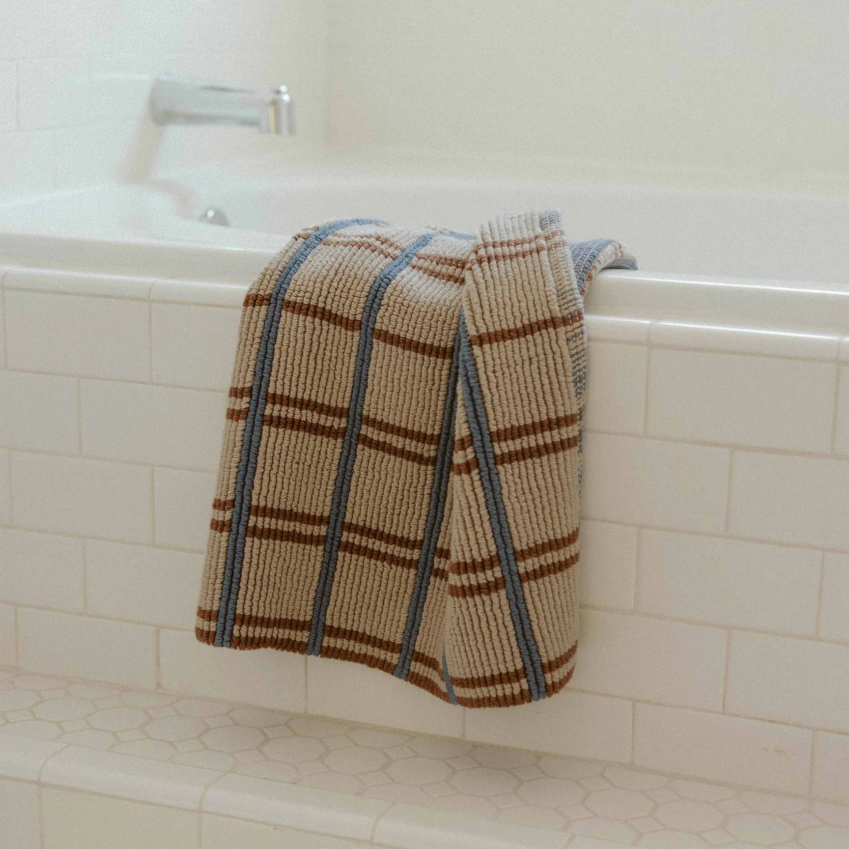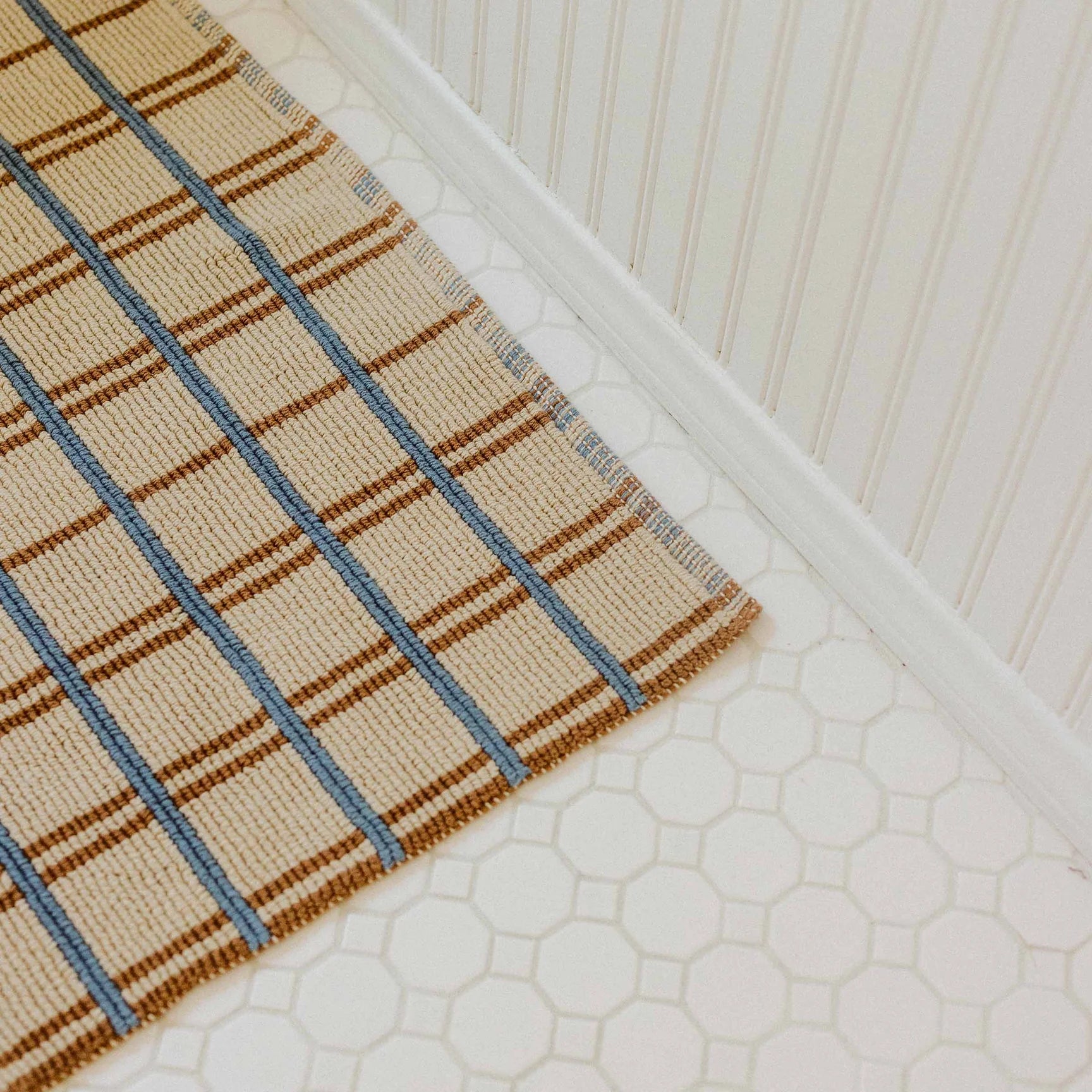 A Morrow best-seller, the Lucia features a smooth surface created by small tight loops. This classic check pattern is now offered in a beautiful Azul and Tan colorway on a soft natural background. We love this washable rug for kitchens and bathrooms.