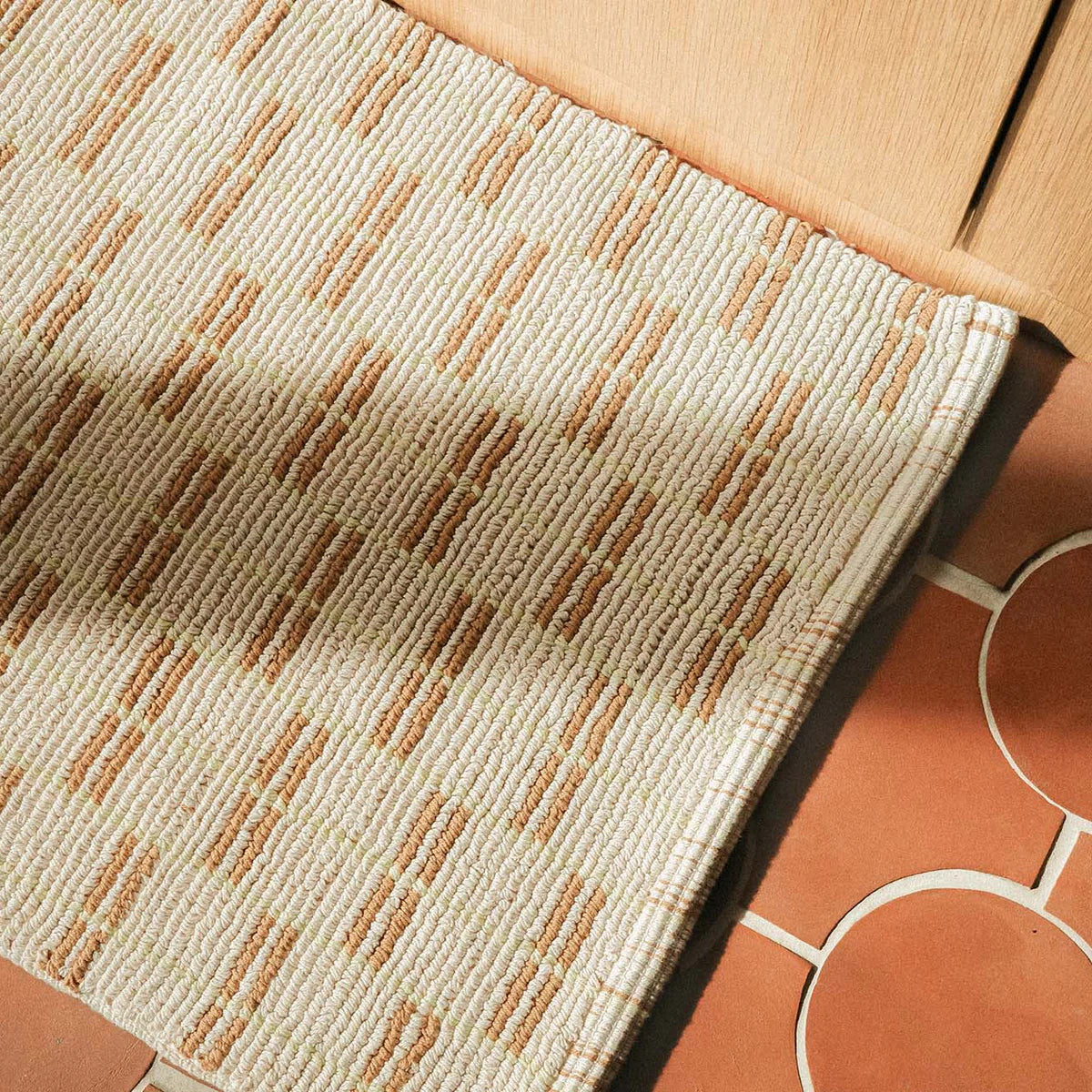 Lupe is our newest style of rug, featuring a smooth surface created by small tight loops. This easy piece has a beautiful broken check pattern in a quirky color combination of lime, tan, and natural. Offered in two sizes, we love this washable rug for kitchens and bathrooms.