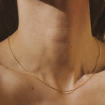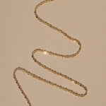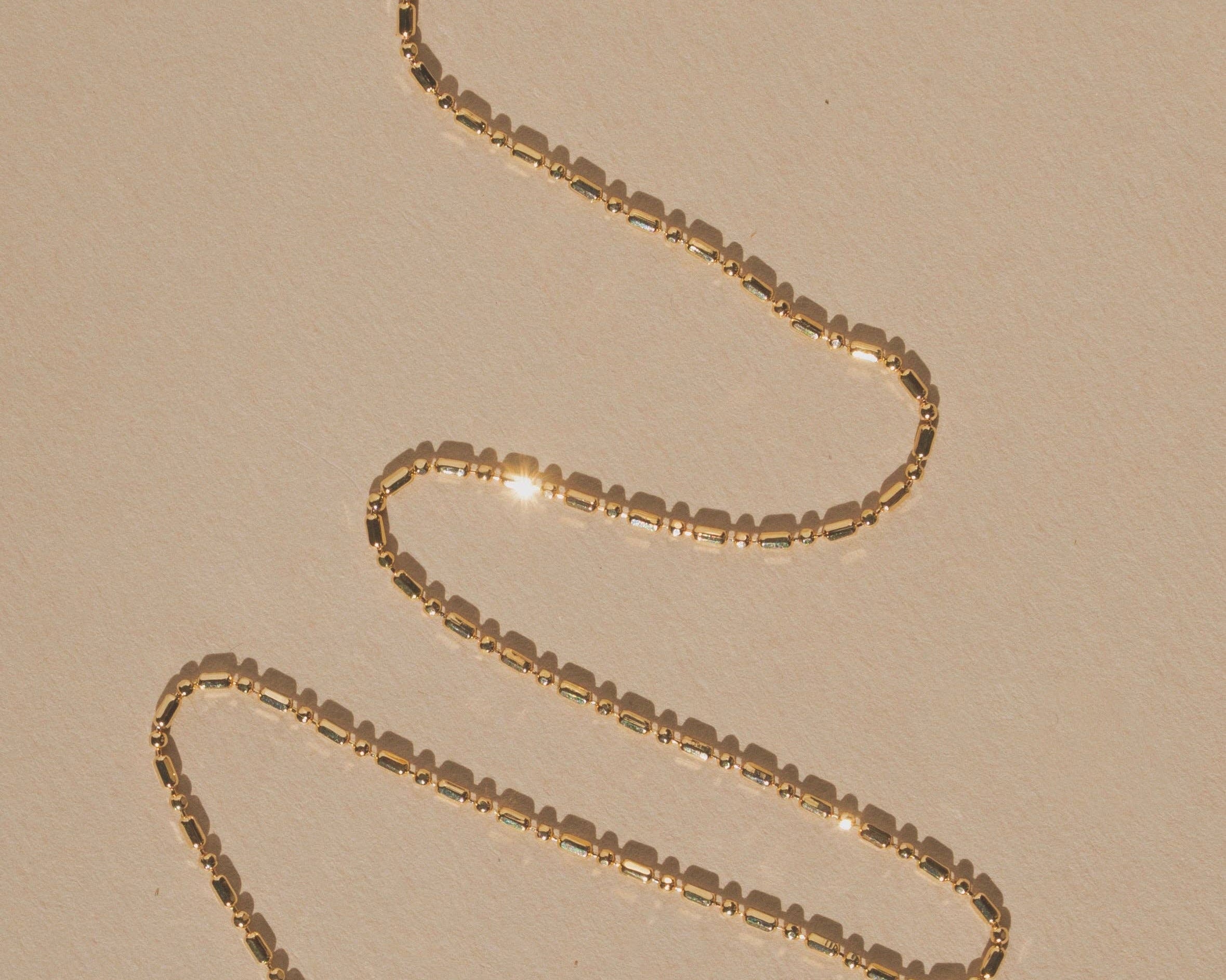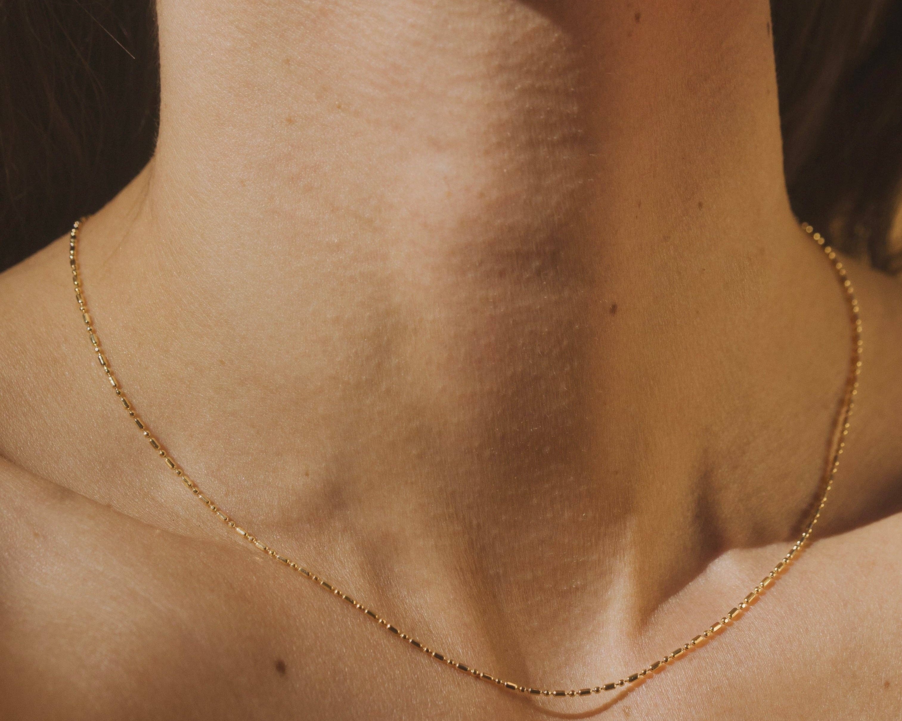 Delicate oval and sphere link chain, a dainty essential that catches light with soft, fluid movement. Simple yet striking, both modern and timeless, an everyday piece that adds warmth and quiet shine.