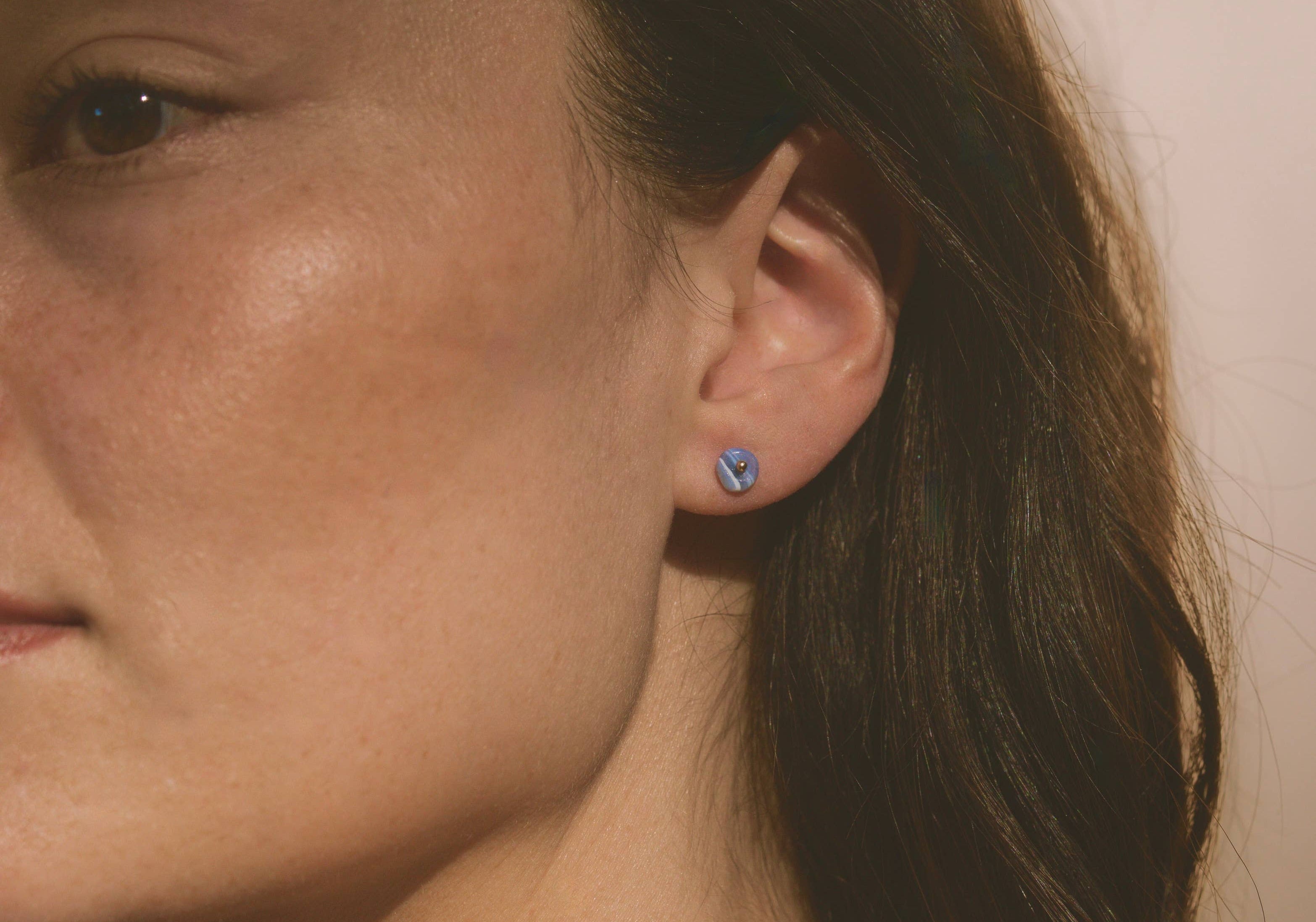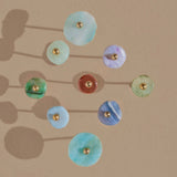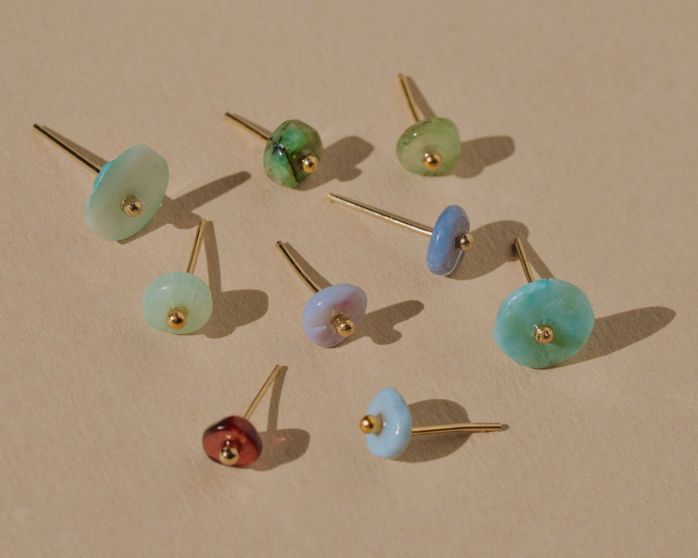 Hand-cut natural gemstone discs are transformed into sculptural stud earrings with a 14k gold-filled ball at their center, creating a harmonious balance between stone and metal. Each disc is subtly uneven and unique, celebrating the organic imperfection and quiet power of natural materials. Minimal yet striking, the Soluna Studs can be worn alone for refined simplicity or layered in multiple piercings for a pop of color and texture. Available in a variety of one-of-a-kind gemstones, each pair with itโs own variation of color, veining, natural inclusions and elemental beauty. ๐บ Let the process unfold naturally ~ we will send out a pendant guided by intuition, chance, love and care ... or ... reach out before purchase to view the current available selection of stones and choose the one that speaks to you. ๐น * ๐ฐ Sold individually - (purchase 2x for a pair) * Stone disc sizes range from: 5mm - 8mm * Available on 14k Gold filled ear posts.ย