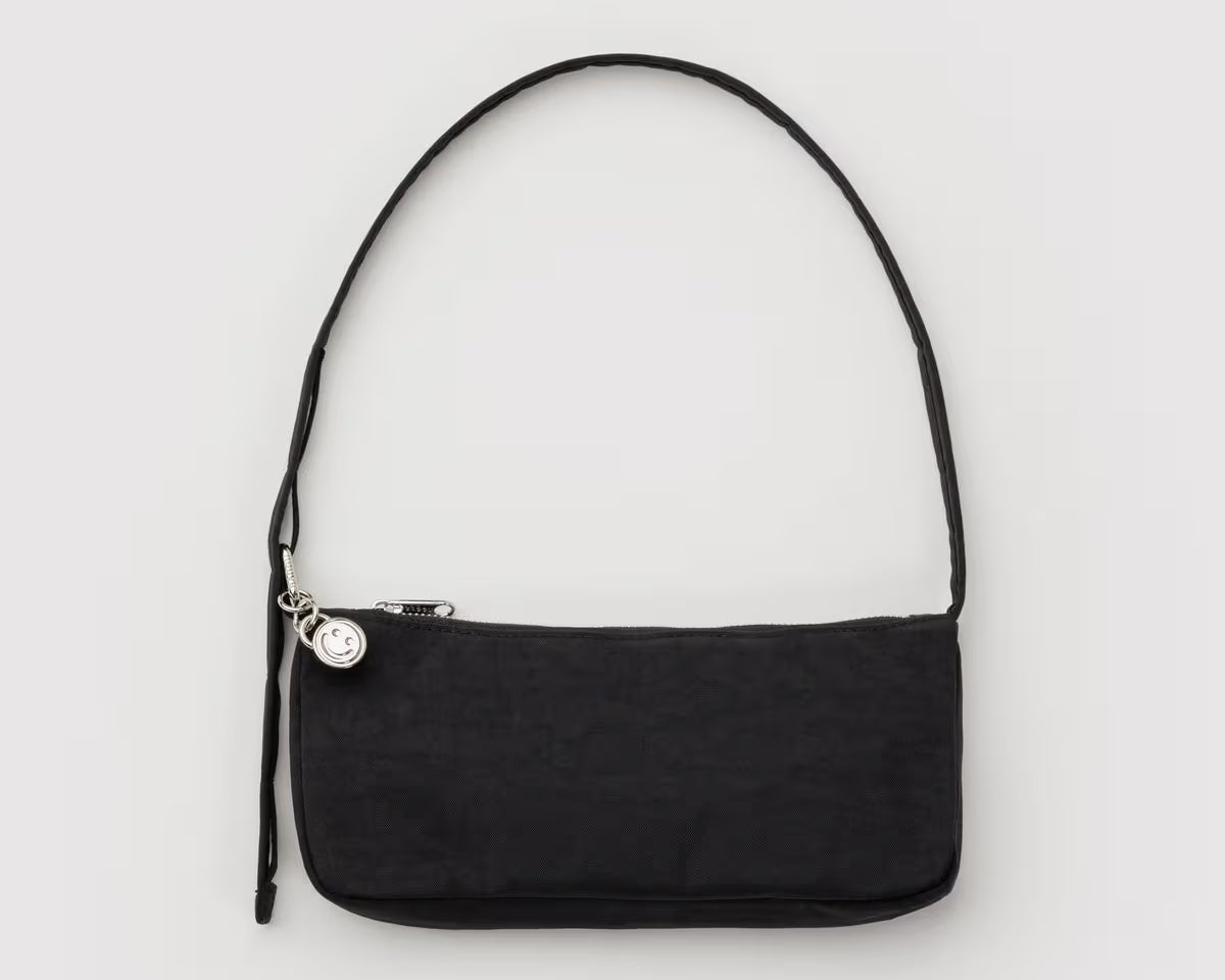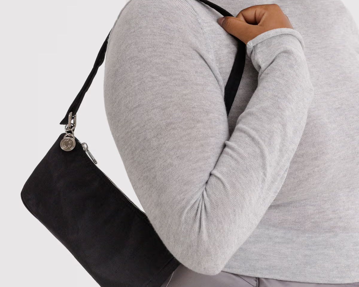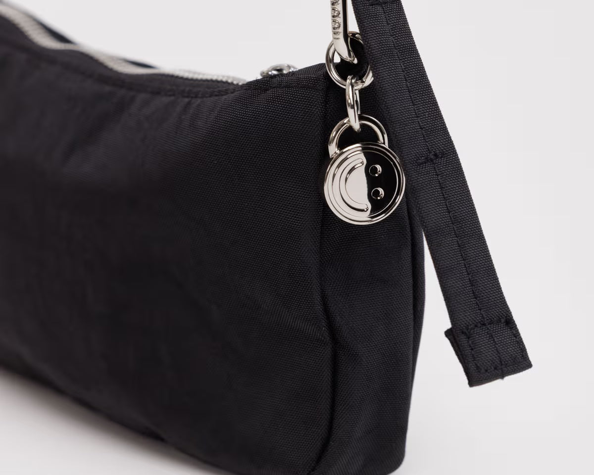 A sleek, compact bag featuring built-in card slots for organization, metal charm, and adjustable strap.