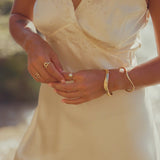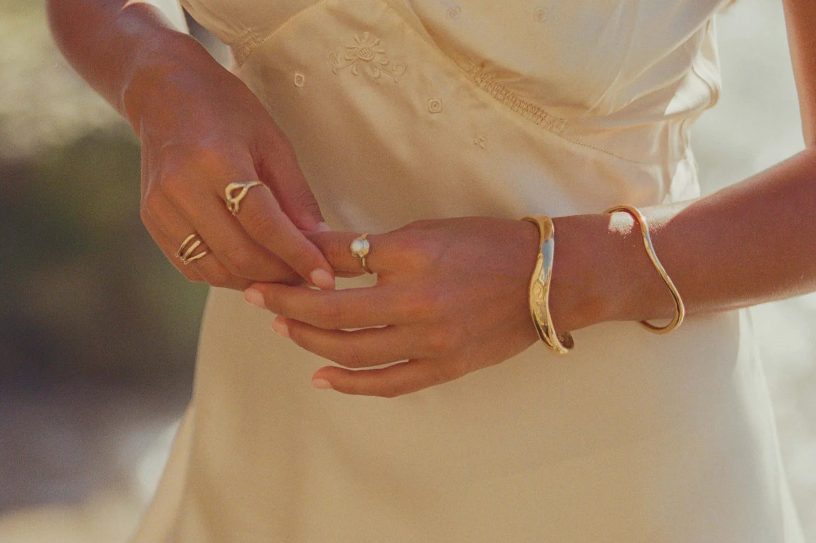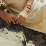 A note on brass rings: The copper in brass rings can react to your ph levels, body sweat, and lotions, causing the area where the ring rests on your finger to turn green. This is harmless and natural. You can apply clear nail polish on the inside to act as a barrier between the metal and your skin. Keep your hands clean, dry, and remove pieces when washing or applying products to keep your ring looking its best.