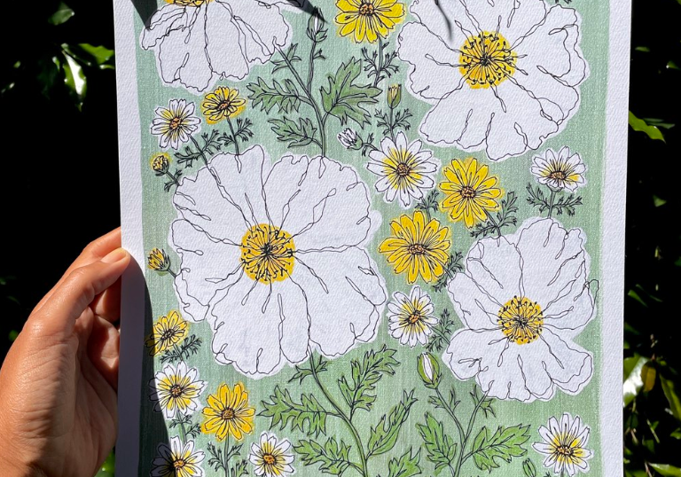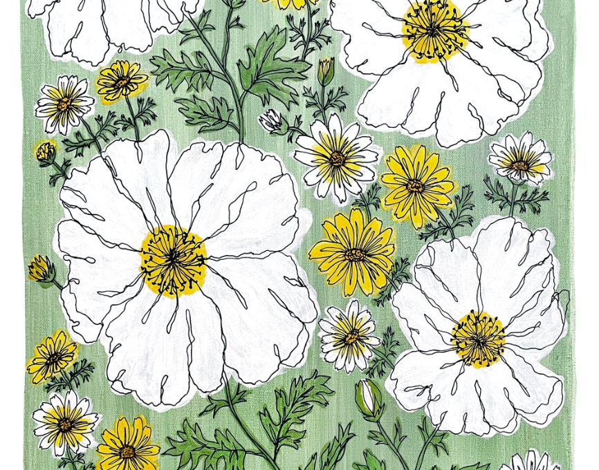 Inspired by the blooming Matilija Poppies and Daisies along the California bluffs.