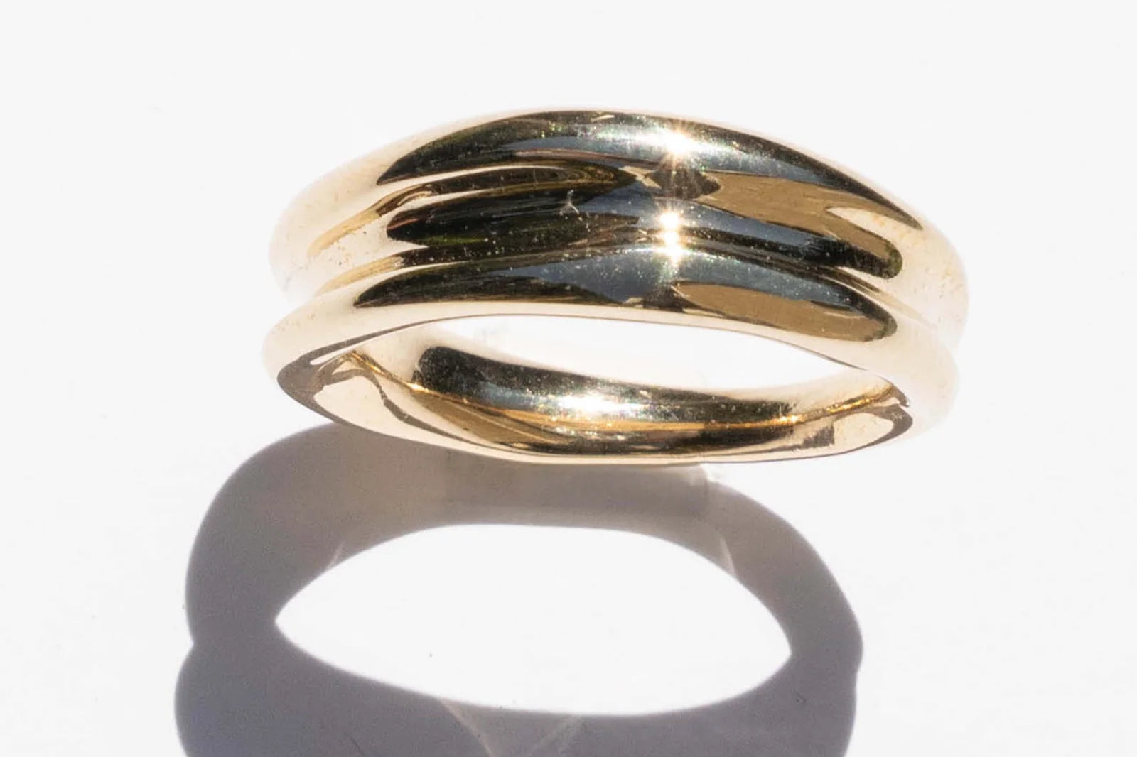 Hand carved and cast with a high polished mirror finish. Available in solid brass, sterling silver, or gold. Ring is 7mm at widest point.