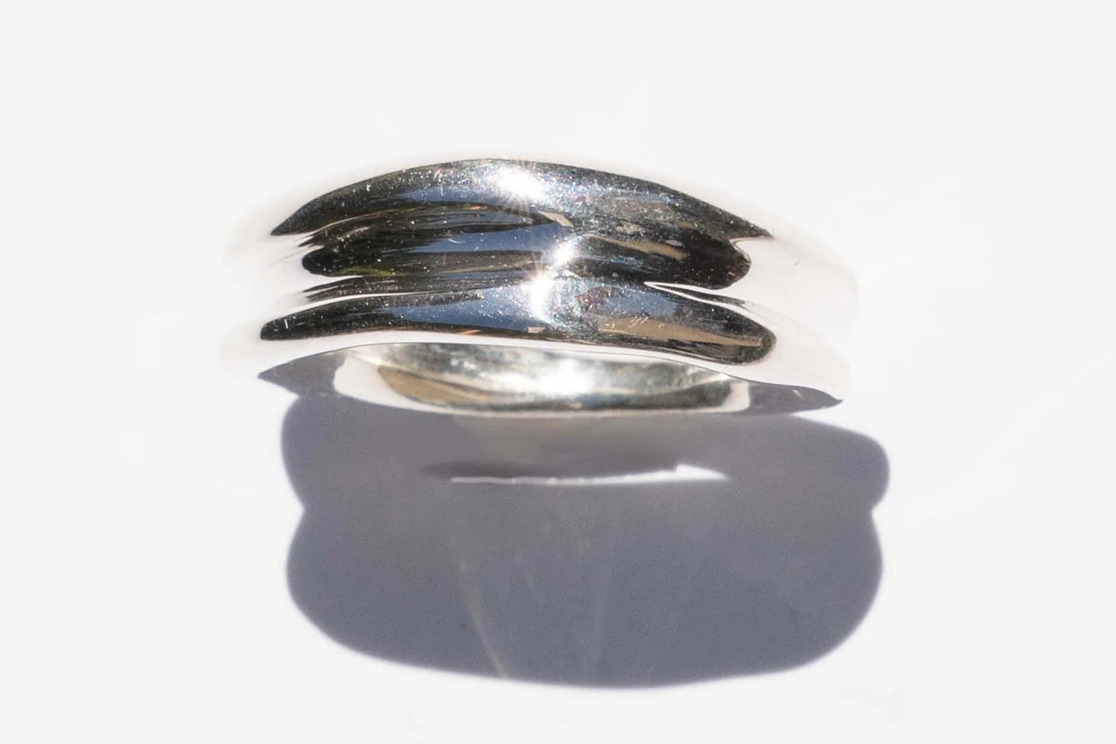 Hand carved and cast with a high polished mirror finish. Available in solid brass, sterling silver, or gold. Ring is 7mm at widest point.