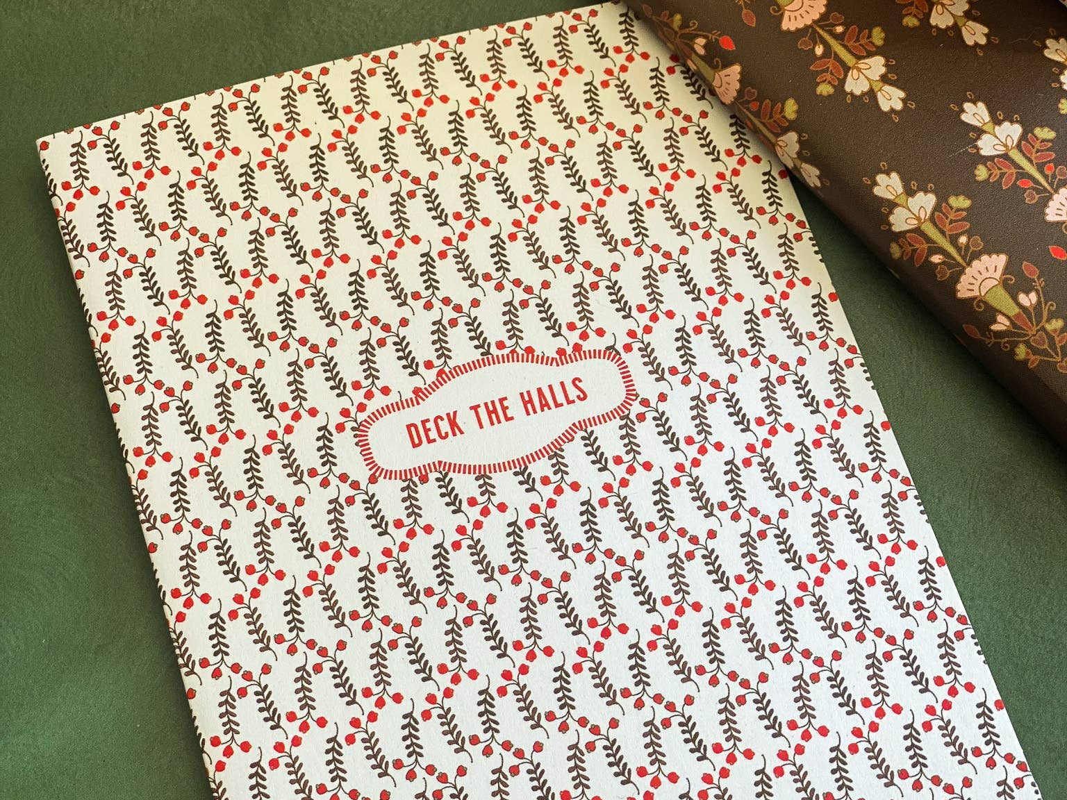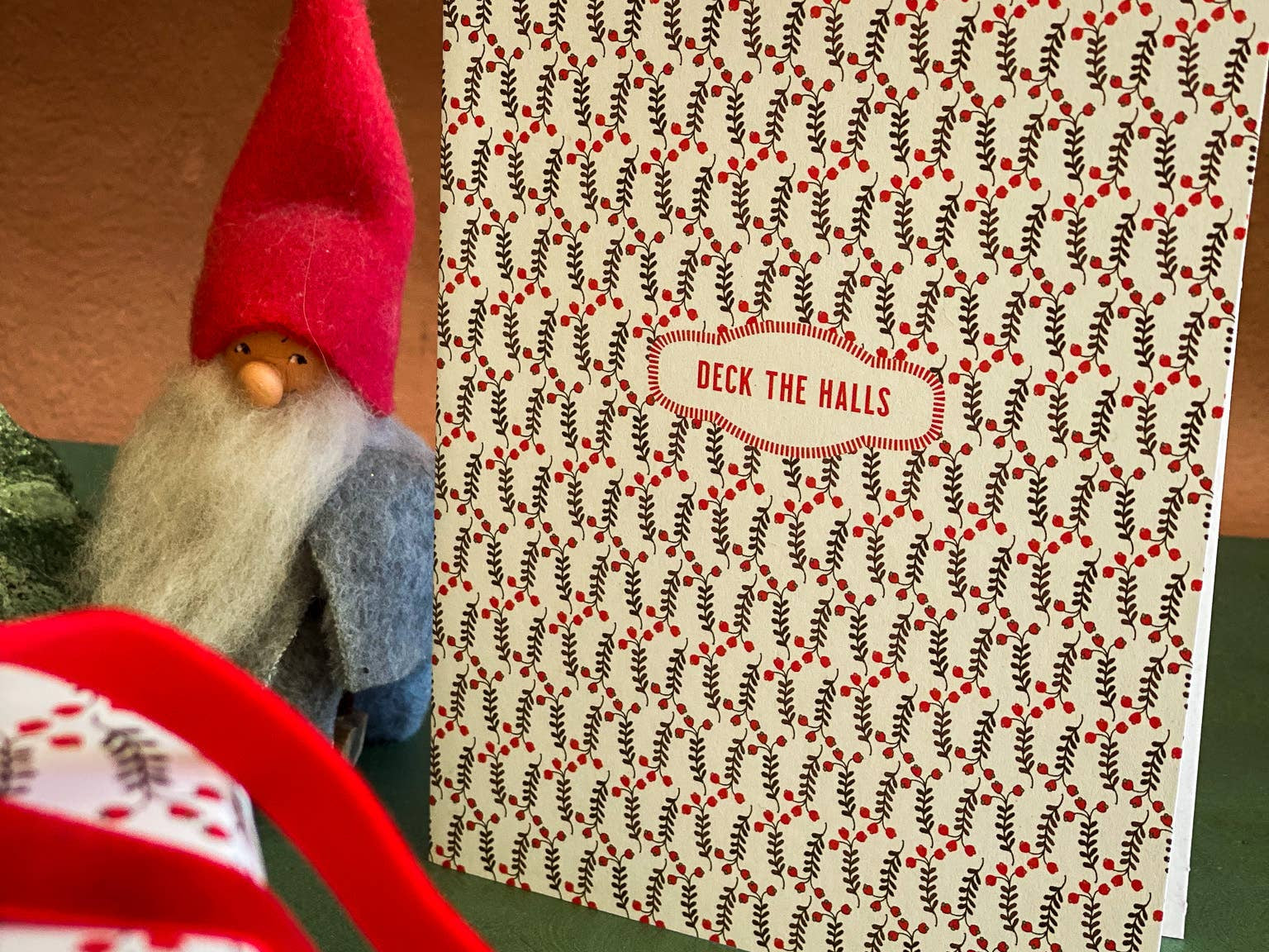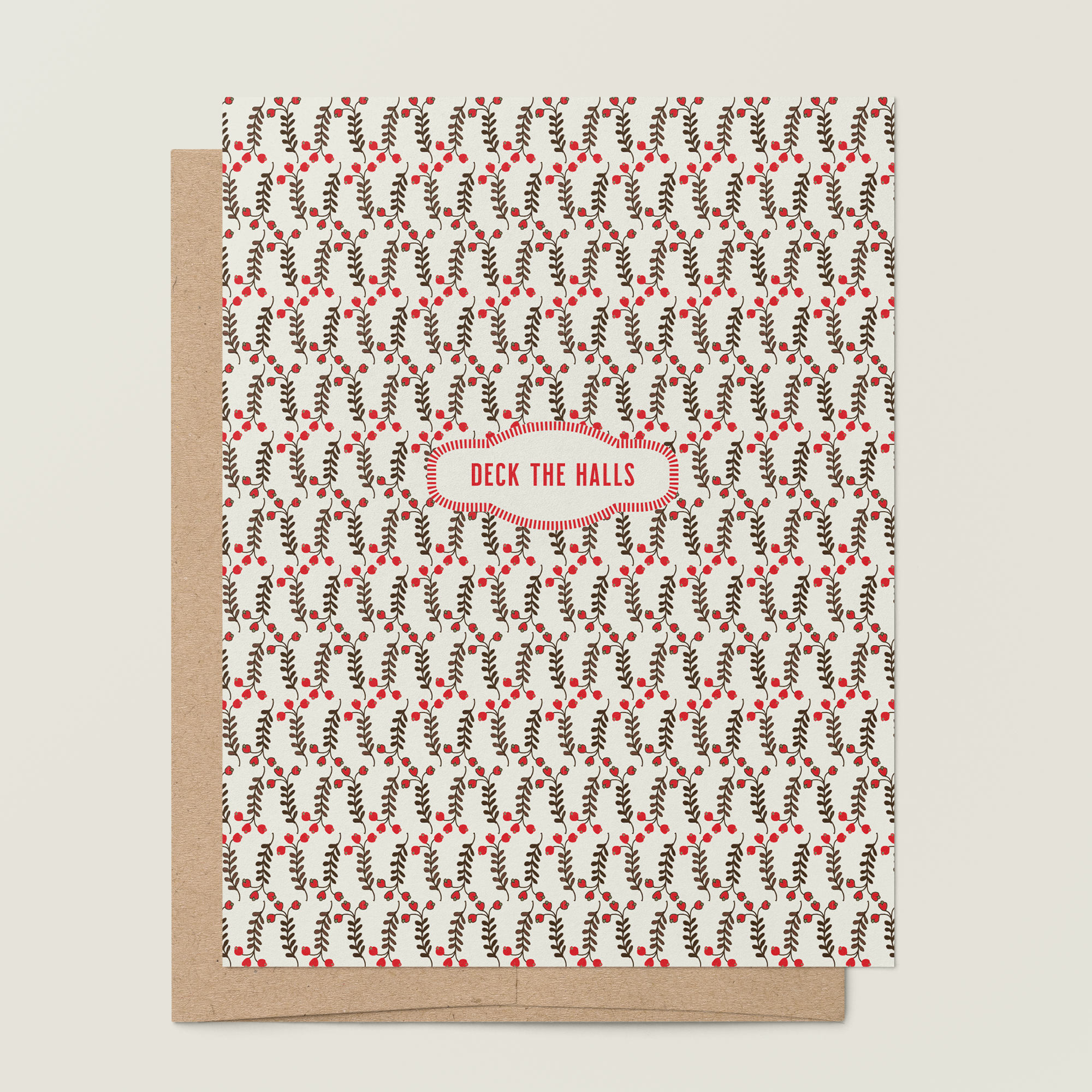 A2 folded Christmas Card with "Deck the Halls" on the front and a blank interior to personalize your own note for the season. This botanical holiday card, in a dainty brown & red berry sprig pattern on a cream background, evokes the coziness of holiday traditions with a modern take on folk-art feel.