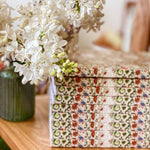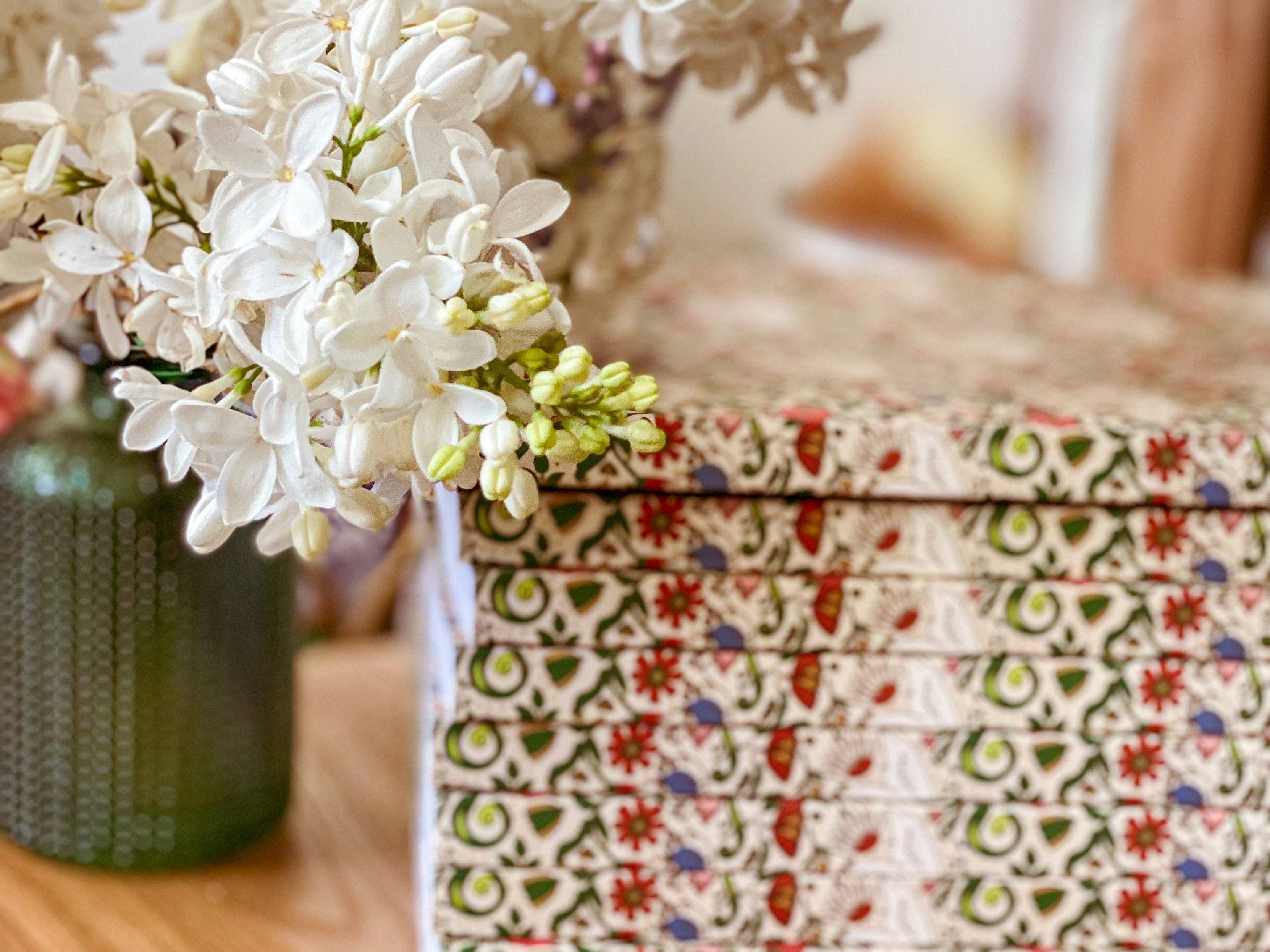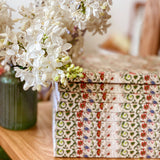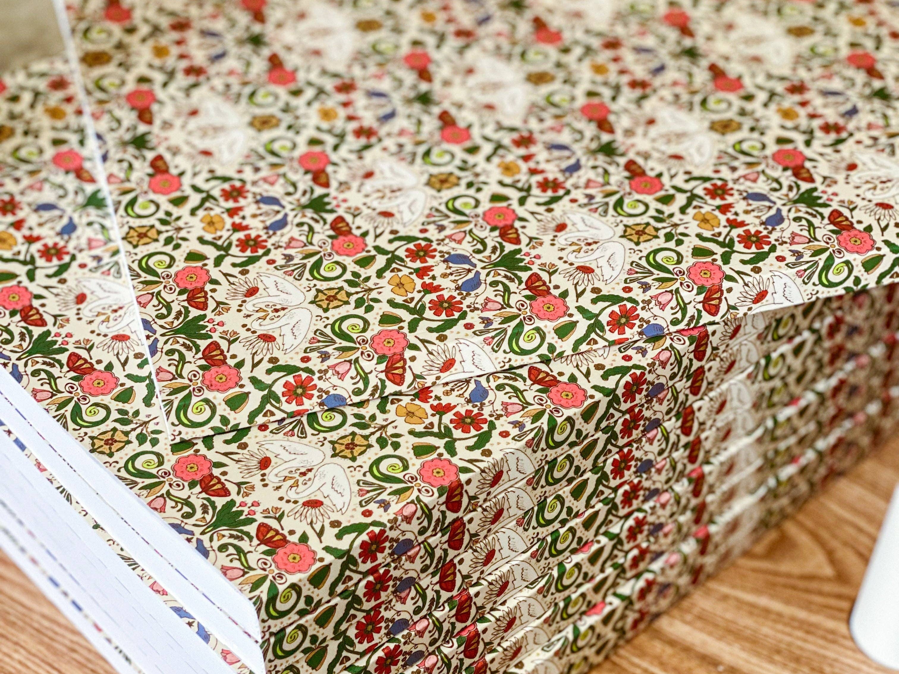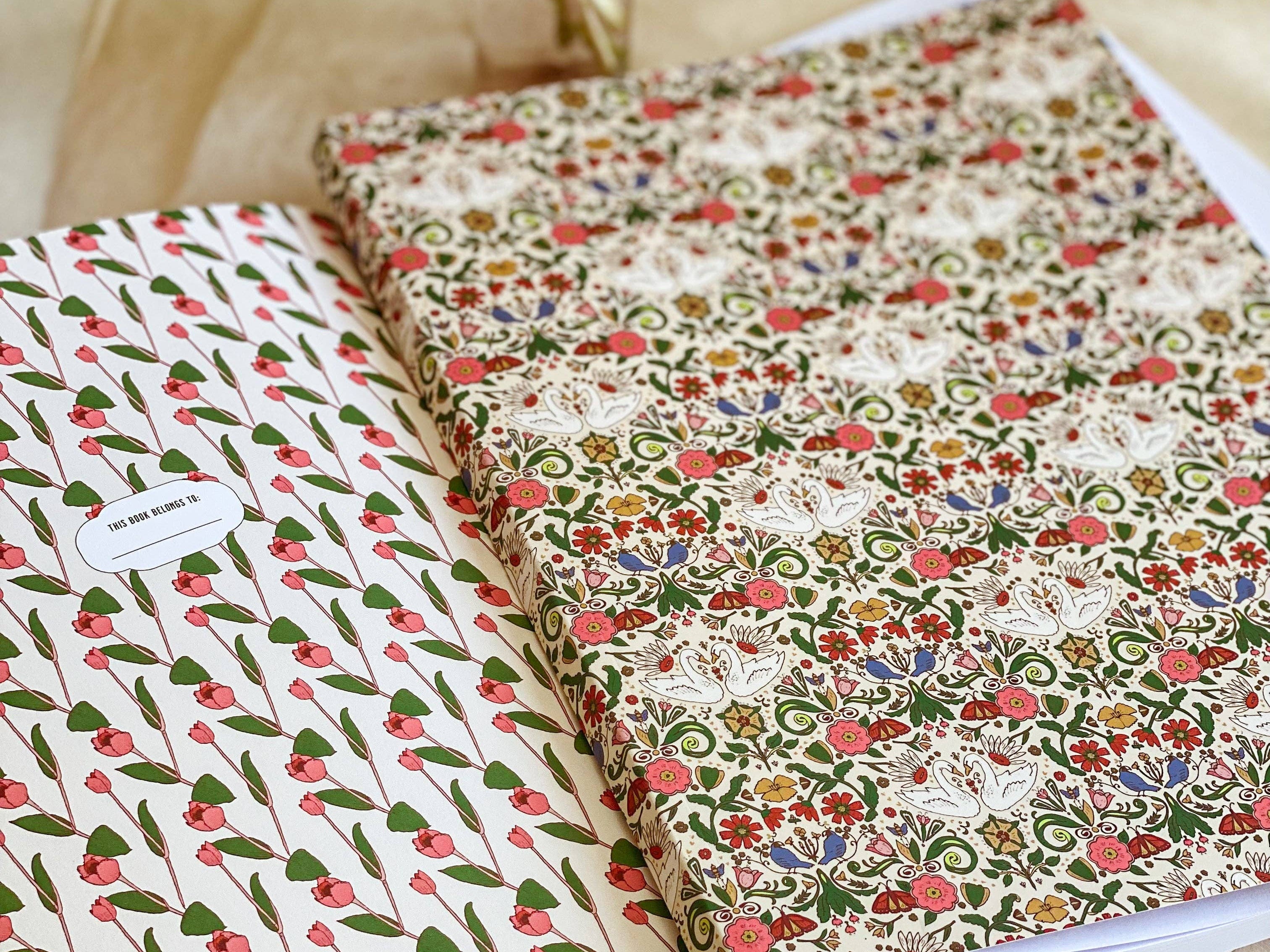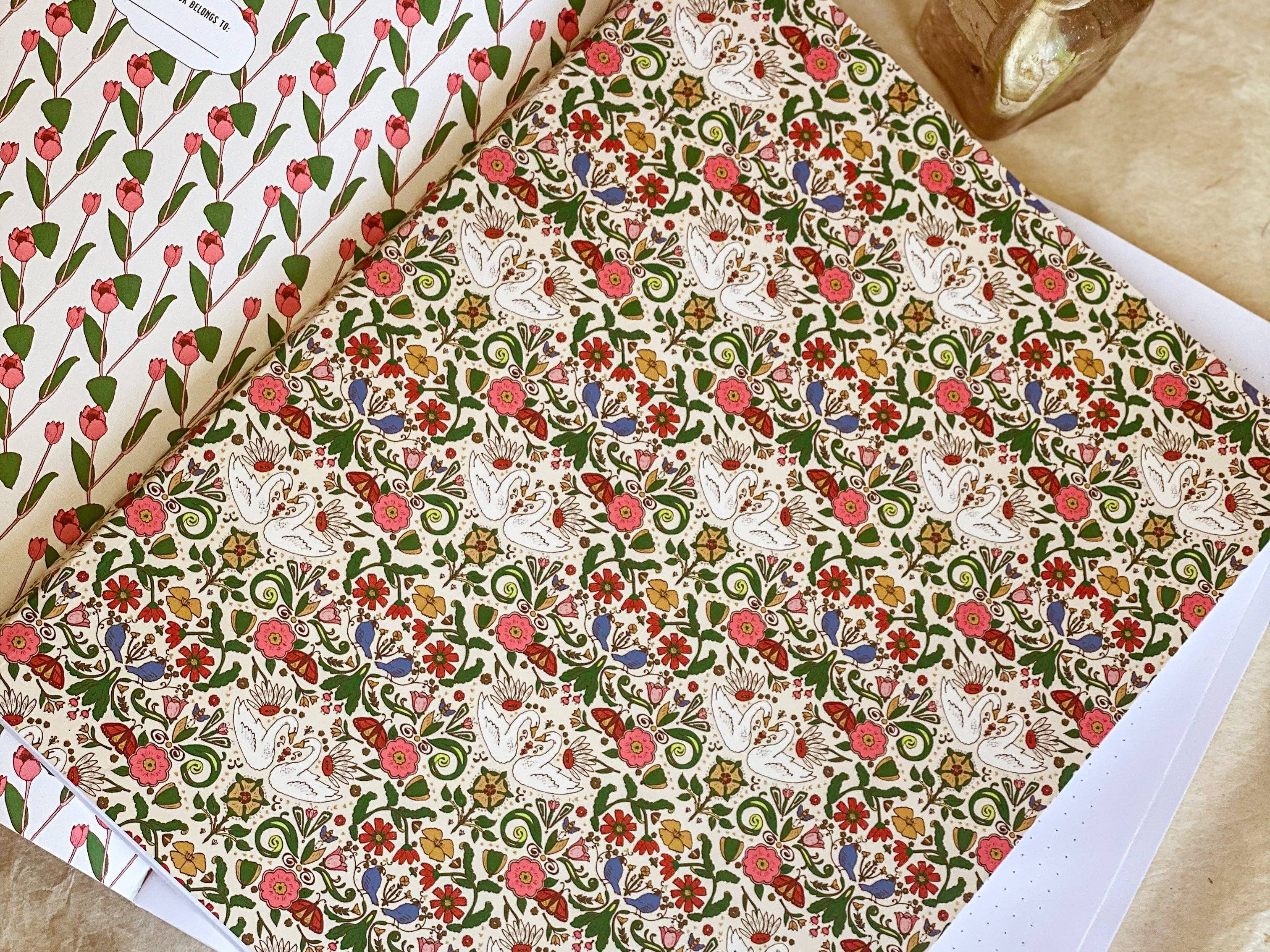 The Cambrifornia notebook highlights the Cambrifornia pattern with the hero multicolored pattern inspired by the birds and flowers of Cambridge, England and California on the cover and a sweet coordinating pink green and cream tulip pattern on the inside cover with a plaque area to write the owner's name. The dot grid pages make it versatile for journaling, notes and sketches. A great year round option for notebook lovers, Mother's Day gift or birthday present, this notebook is a great addition to any stationery or gift shop year round.