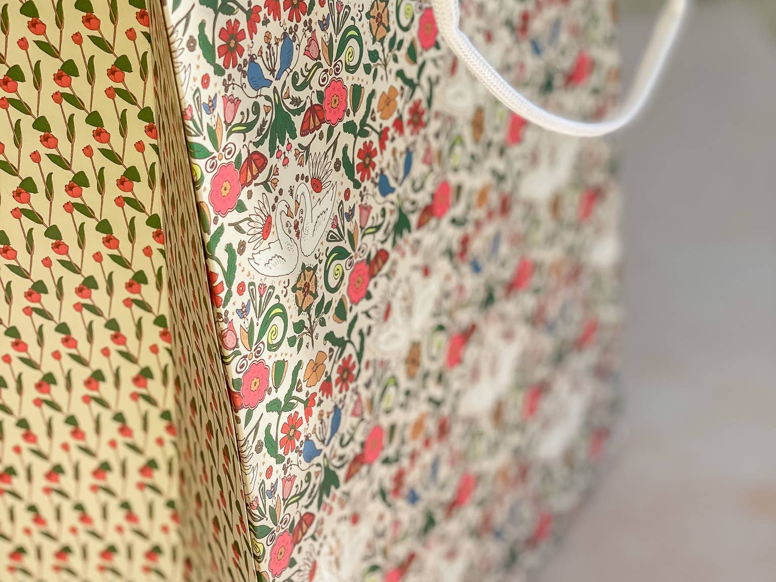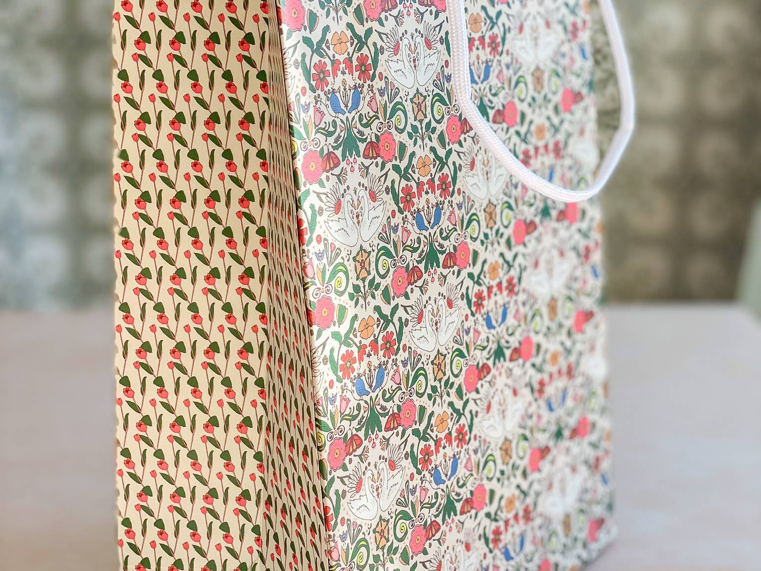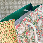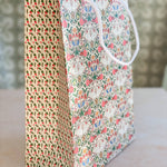 Make gift wrapping easy with the “Cambrifornia” Gift Bag. “Cambrifornia” features the customer favorite Cambrifornia floral and bird multicolored pattern accented by a pink and green tulip floral pattern on the gusseted sides and a white braided handle. This bag will take you from Valentine's Day to birthday’s, baby and bridal showers and celebrations throughout the year.