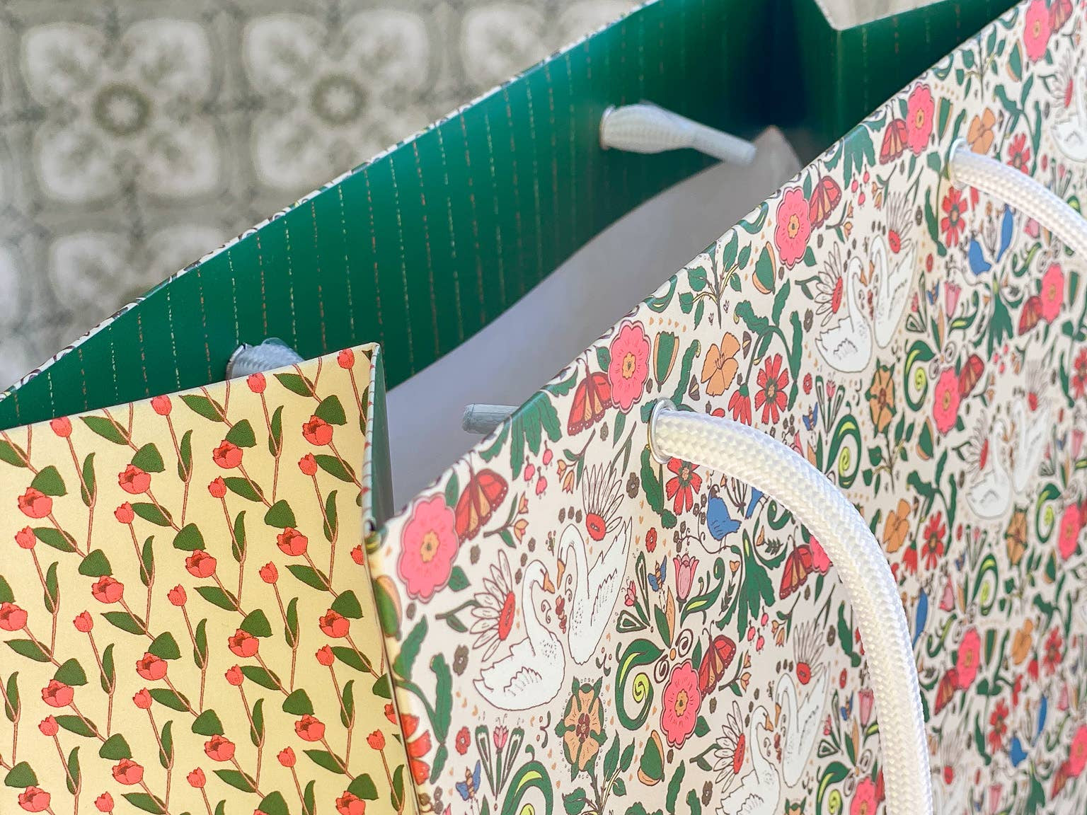 PRODUCT DETAILS: • 13" H x 9.6" W x 4.5" D • Responsibly Sourced High-Grade Sturdy Paper Stock. • Twice as thick and strong as the average gift bag and a scuff-proof matte finish for a premium feel. • Soft braided rope handles in colors that complement the designs. • Made in the USA. Designed in California.