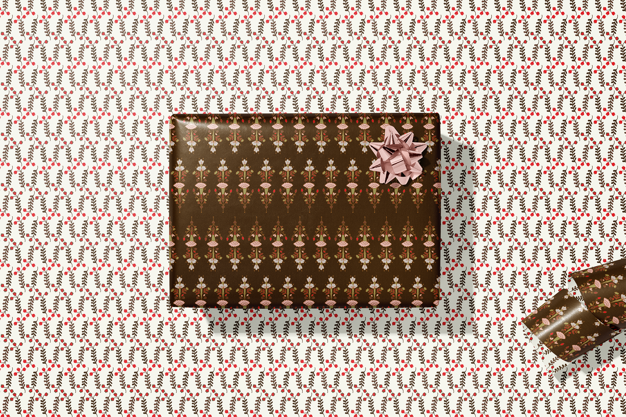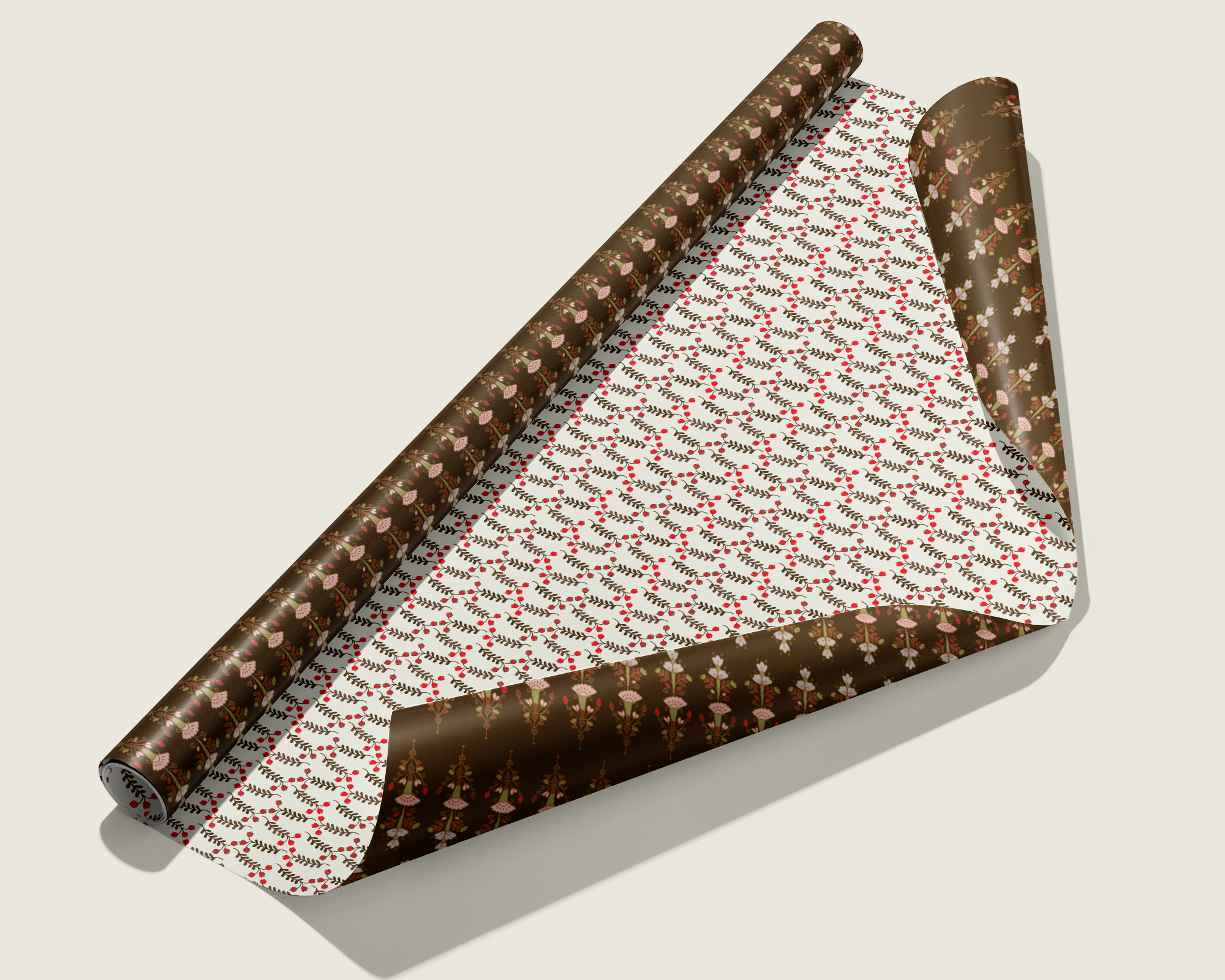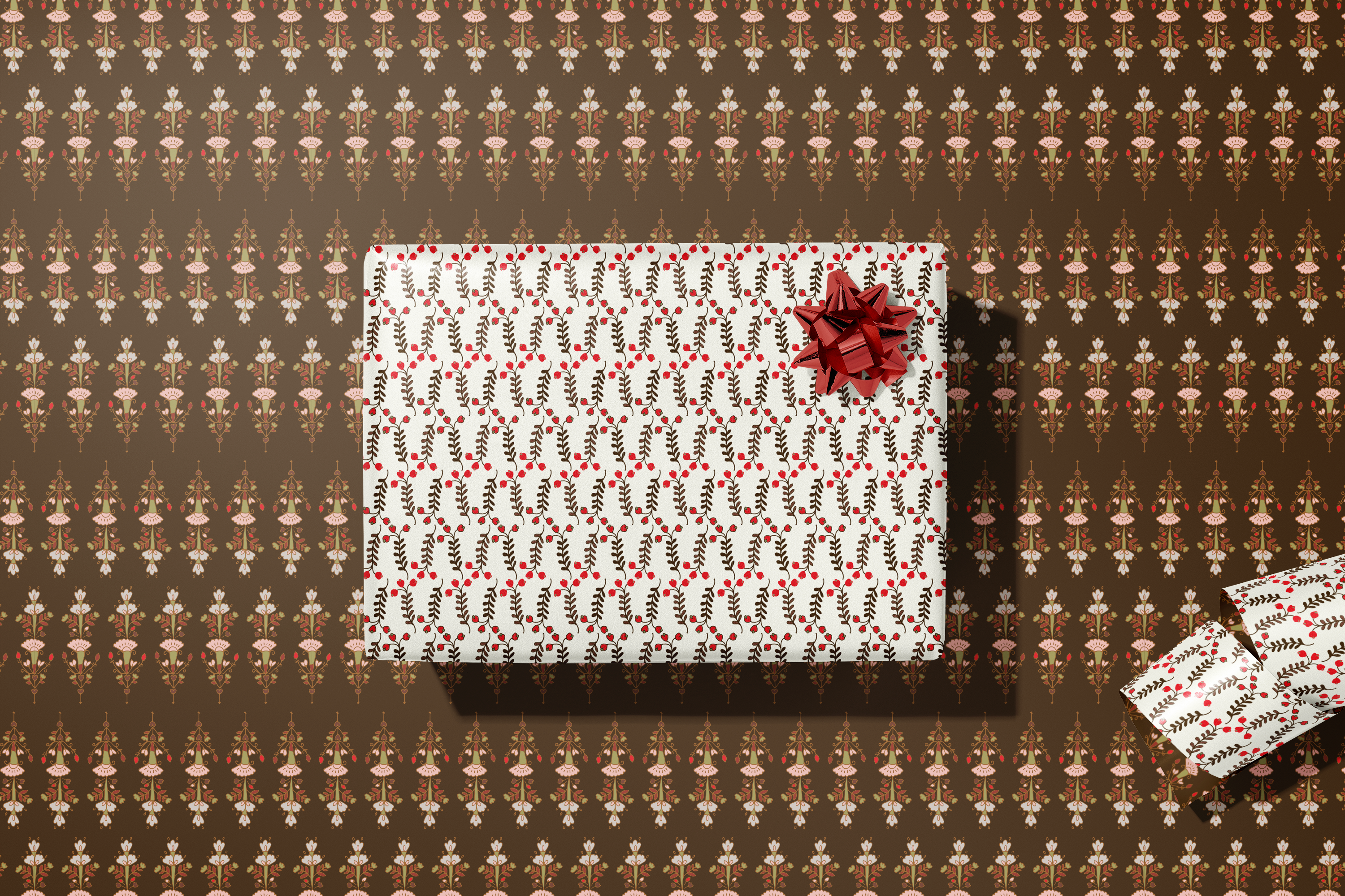 Double-sided wrapping paper featuring a nordic floral pattern on a rich chocolate background on one side and brown and red berry sprig on cream on the other.