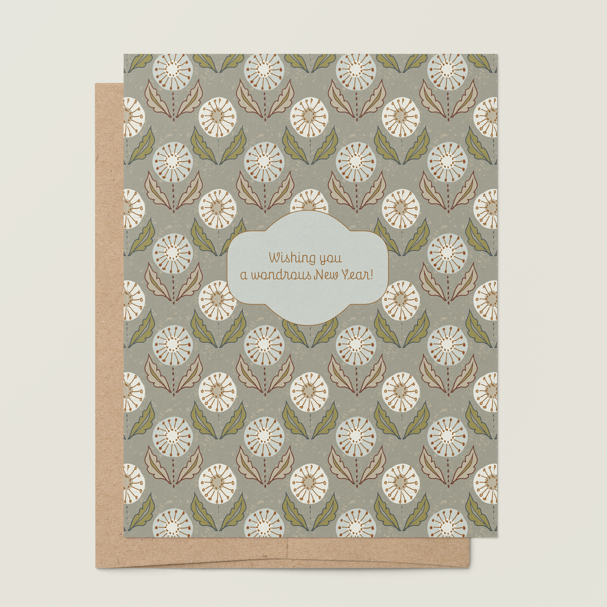 Make a wish with this A2 folded holiday card with a wintery dandelion pattern with "Wishing you and wondrous New Year!" and a blank interior to personalize your own note.