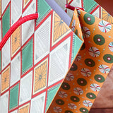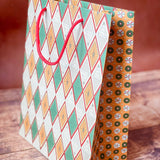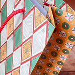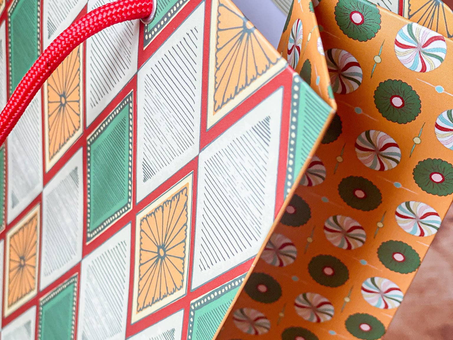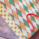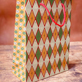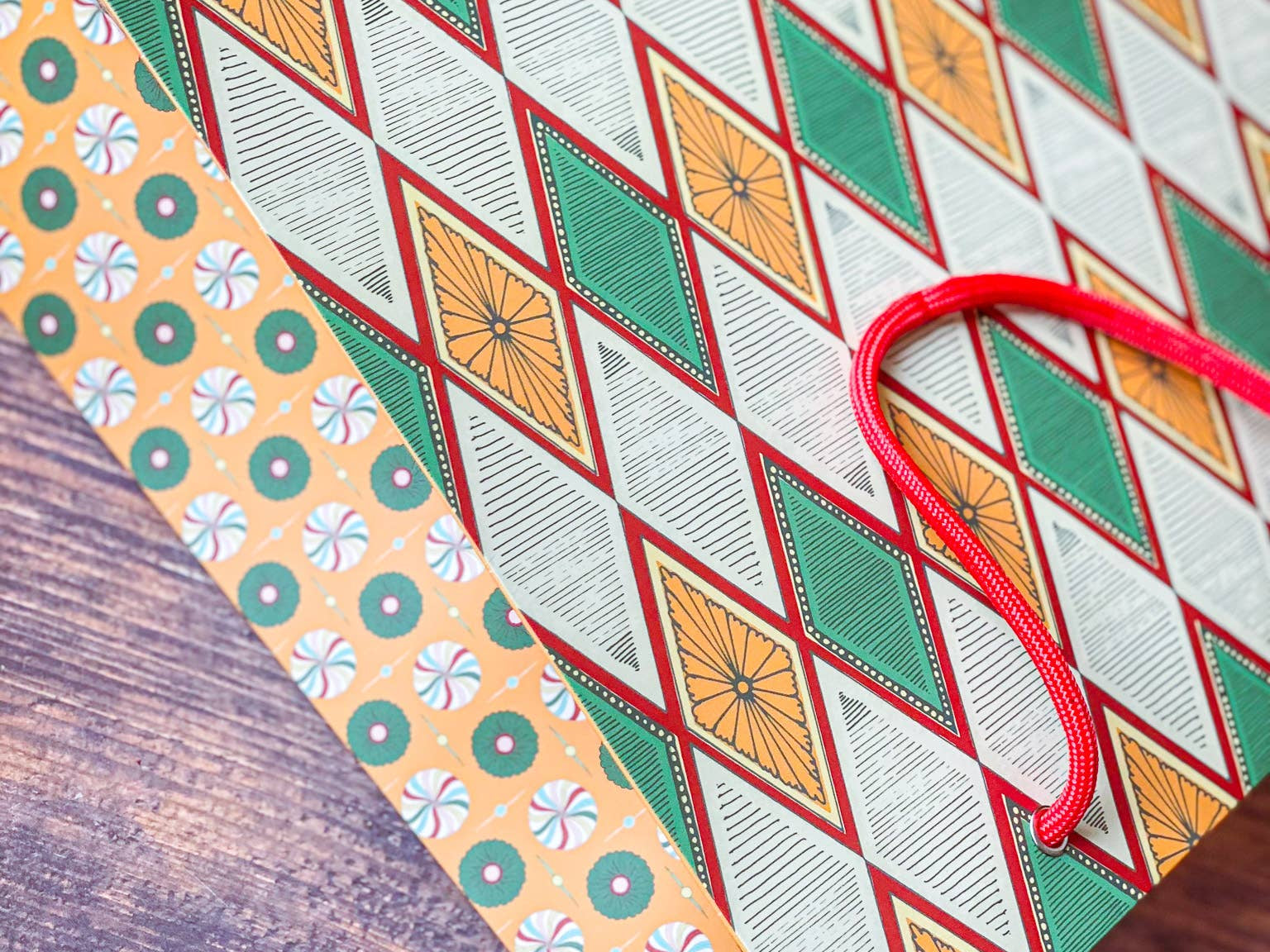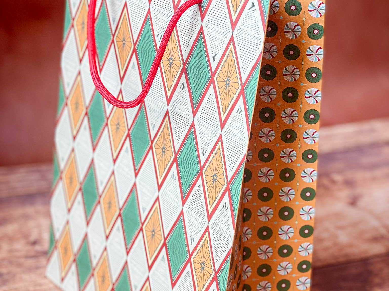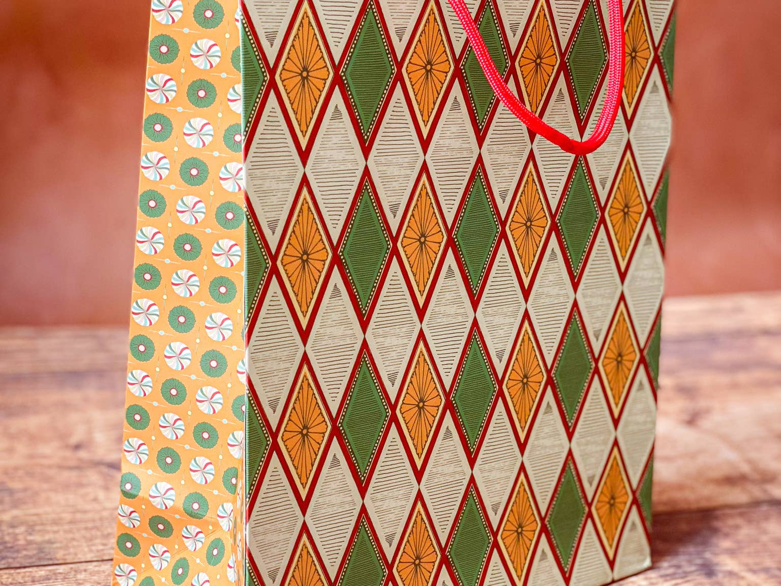 Make gift wrapping easy and festive with the “Harlequin” holiday Gift Bag. Combining nostalgic mid-century motifs with playful patterns reminiscent of classic fairgrounds and retro holiday décor, this premium bag features a hero diamond pattern in yellow, red and green pattern accented by a geometric candy and wreath rosette motif on a yellow background on the gusseted sides and a green braided handle. Add a coordinating gift tag to the bag handle for a personal touch.