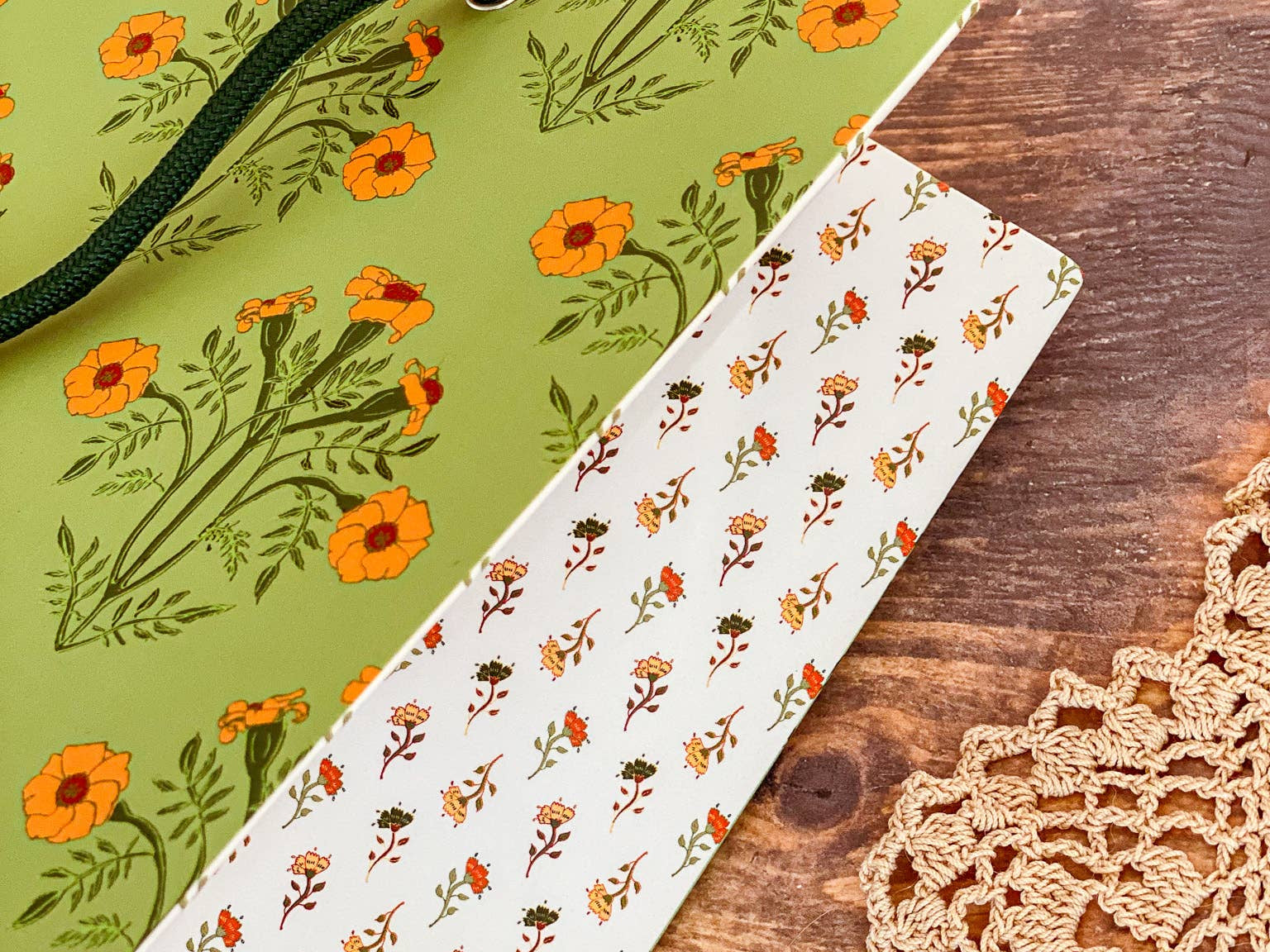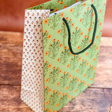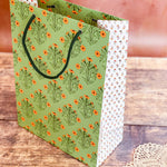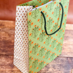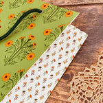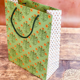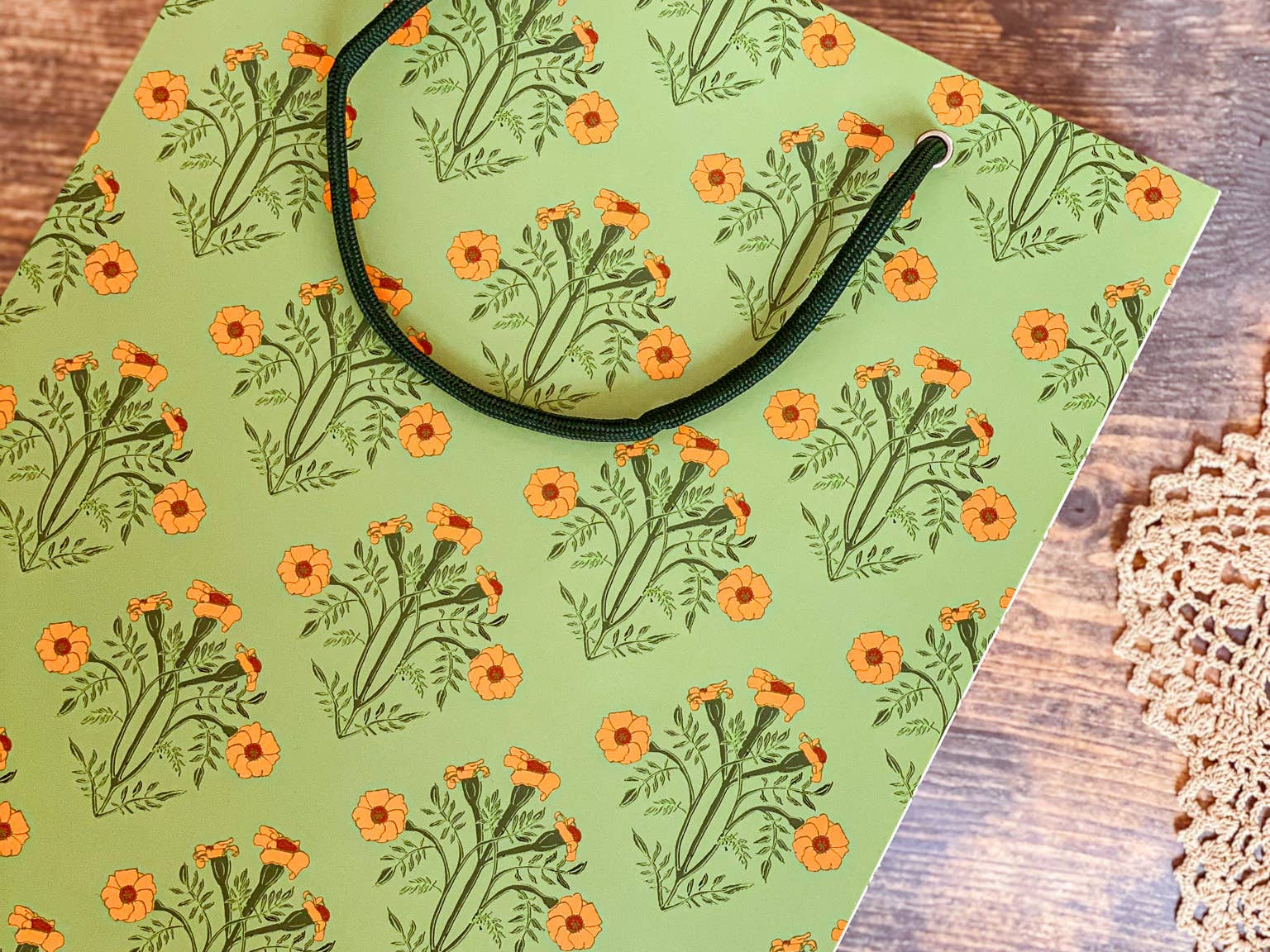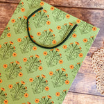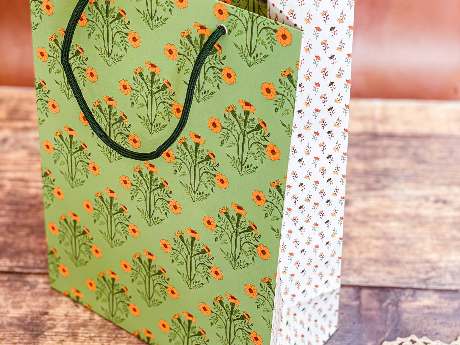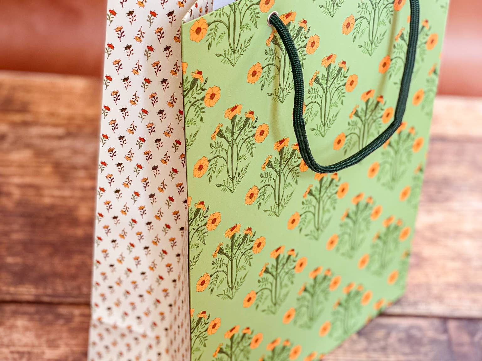 Featuring a vibrant green and orange French marigold pattern on one side and an off-white background with orange and green ditsy floral sprig print on the gusset sides. This gift bag suits men and women alike and works well throughout the year for birthdays and holidays.