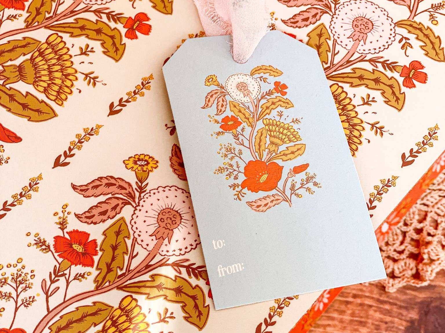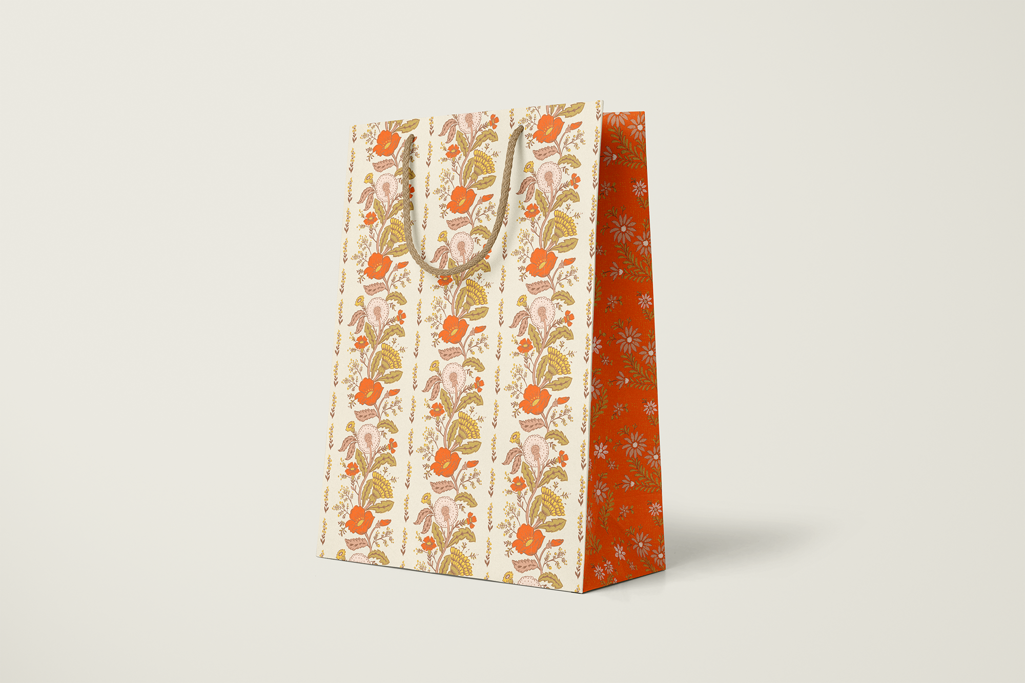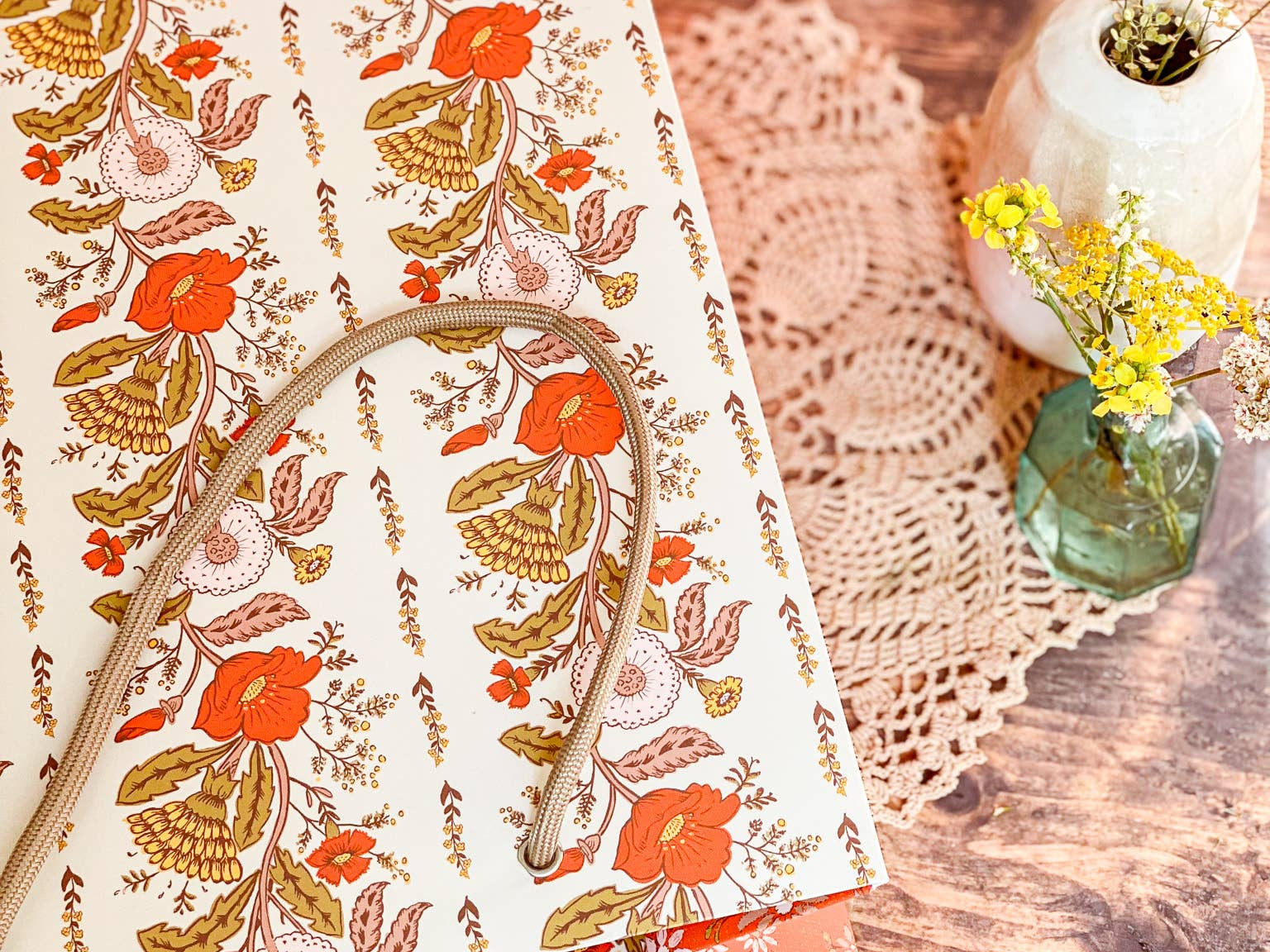 Make gift wrapping easy with the “Sunlace” Gift Bag. Whether on it’s own or paired with our double-sided gift wrap, our premium gift bags will make for an extra special gifting presentation. Featuring a pair vintage textile inspired botanical floral patterns wrapped in a warm wildflower palette with yellows, oranges, pale pinks and greens. Soft, sun-soaked, and slightly romantic, it has a nostalgic charm of 60s/70s floral prints and embroidered flower fabrics. Wonderful for Summer and Fall birthdays, housewarmings, baby showers, weddings and beyond.