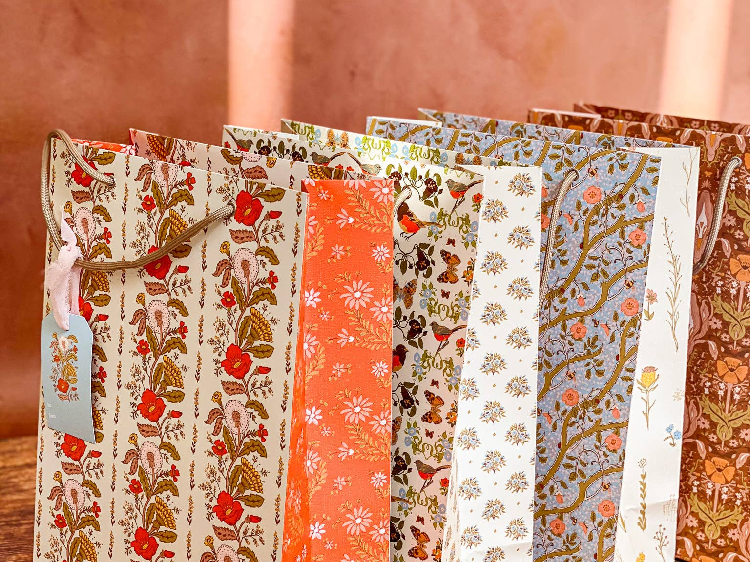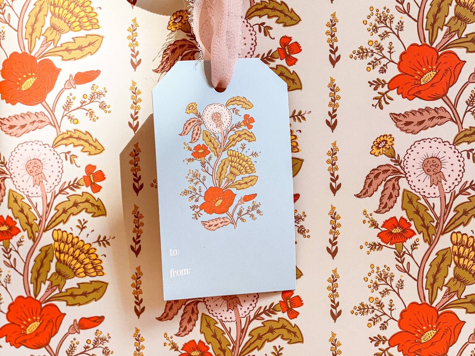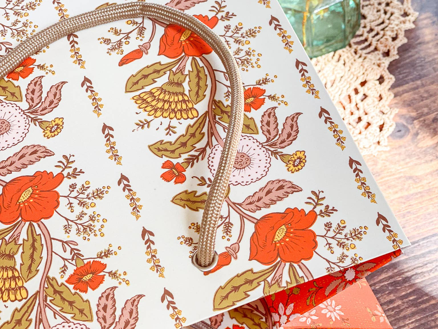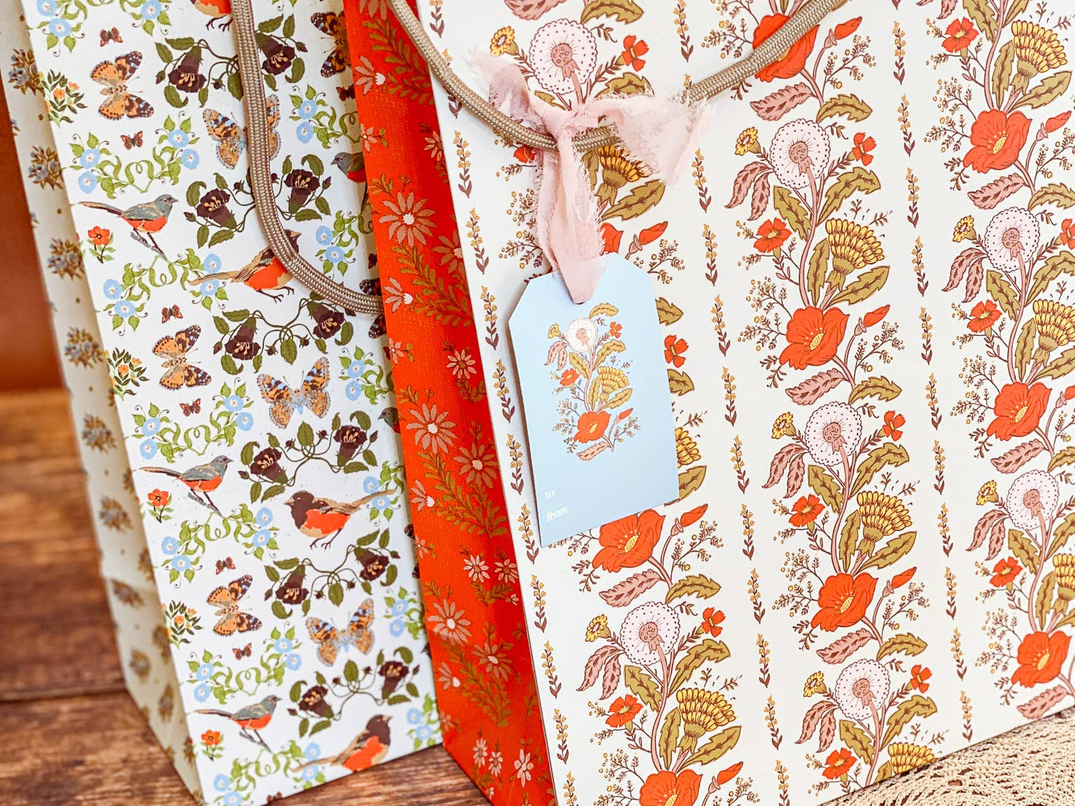 Make gift wrapping easy with the “Sunlace” Gift Bag. Whether on it’s own or paired with our double-sided gift wrap, our premium gift bags will make for an extra special gifting presentation. Featuring a pair vintage textile inspired botanical floral patterns wrapped in a warm wildflower palette with yellows, oranges, pale pinks and greens. Soft, sun-soaked, and slightly romantic, it has a nostalgic charm of 60s/70s floral prints and embroidered flower fabrics. Wonderful for Summer and Fall birthdays, housewarmings, baby showers, weddings and beyond.