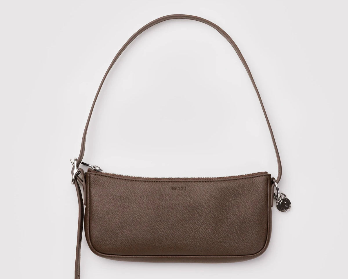 Made from recycled leather, our sleek Pochette features built-in card slots for organization, a metal smiley face charm, and an adjustable strap.