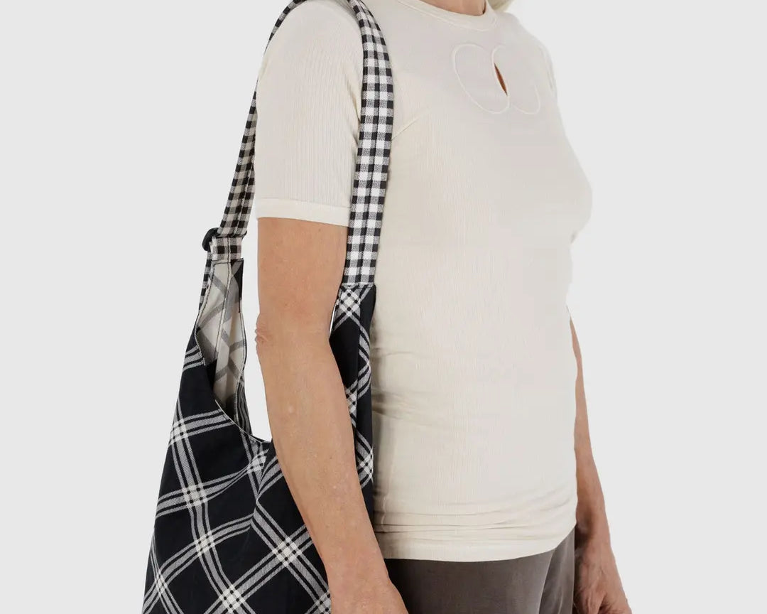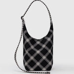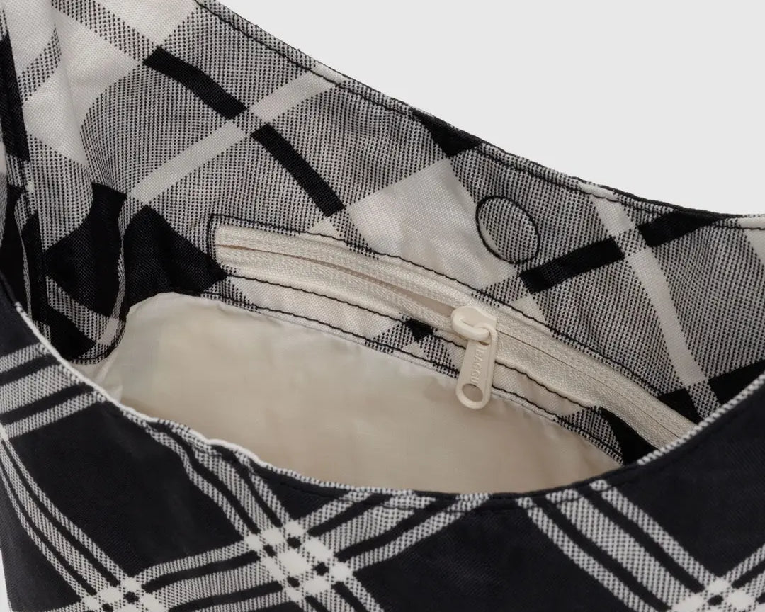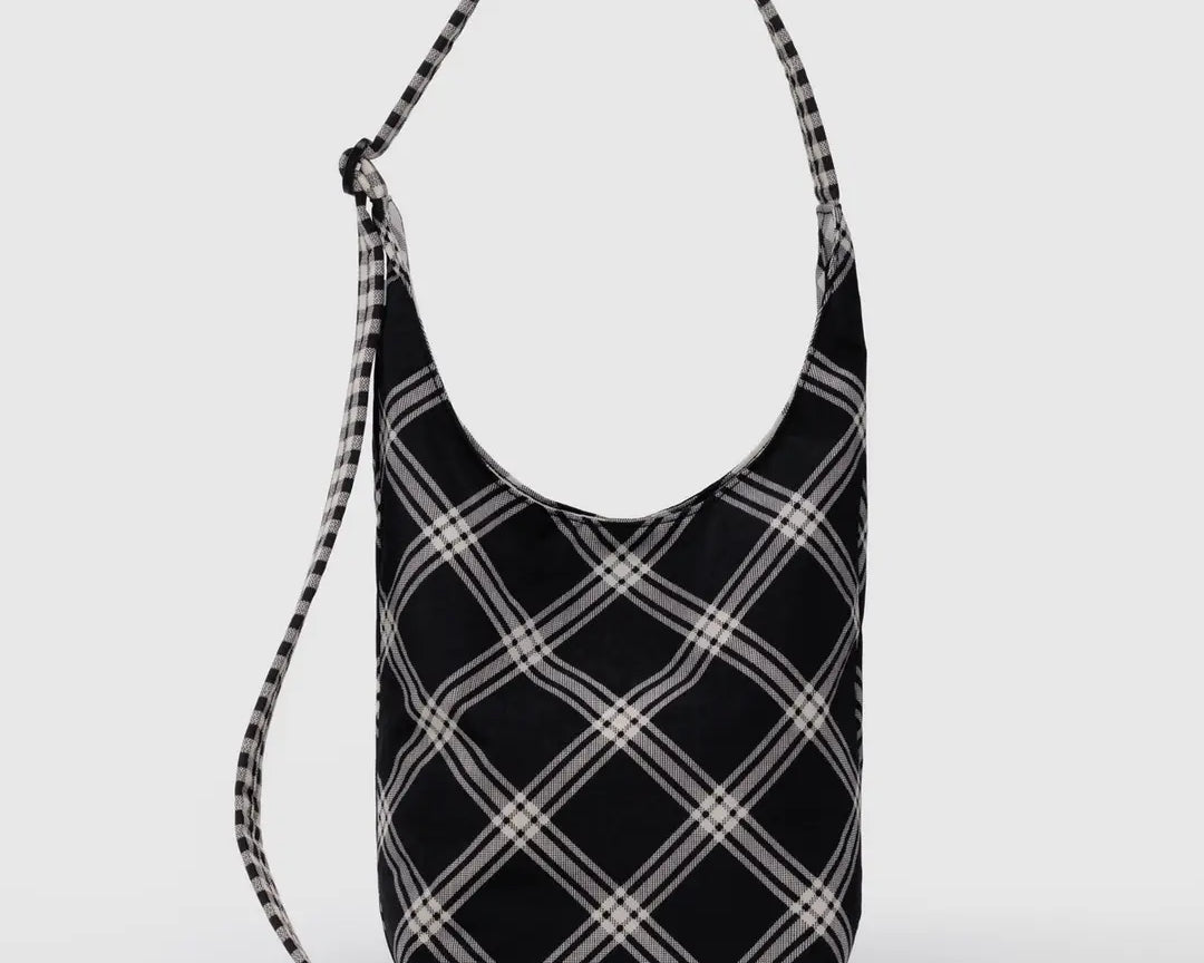 A slouchy, softly structured nylon bag with an adjustable strap. Interior zip pocket with a magnetic closure.