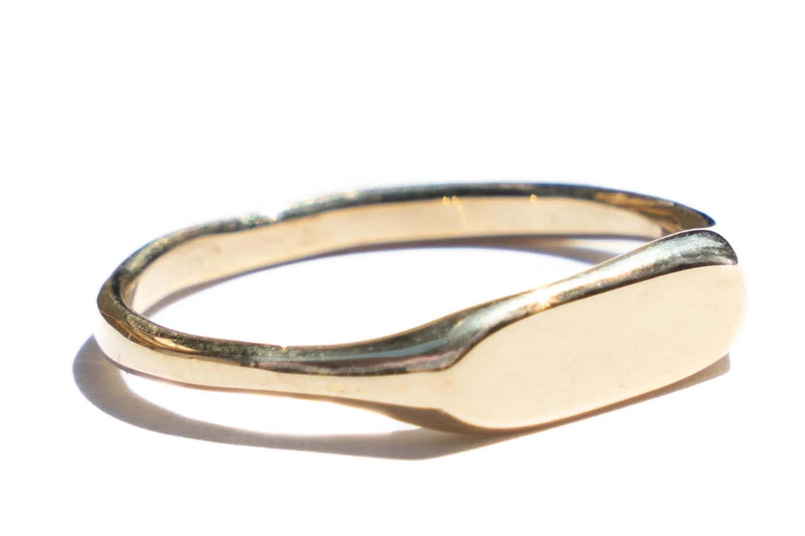 Hand carved and cast with a high polished mirror finish. Available in solid brass, sterling silver, or gold. Ring measures 4 mm at widest point.
