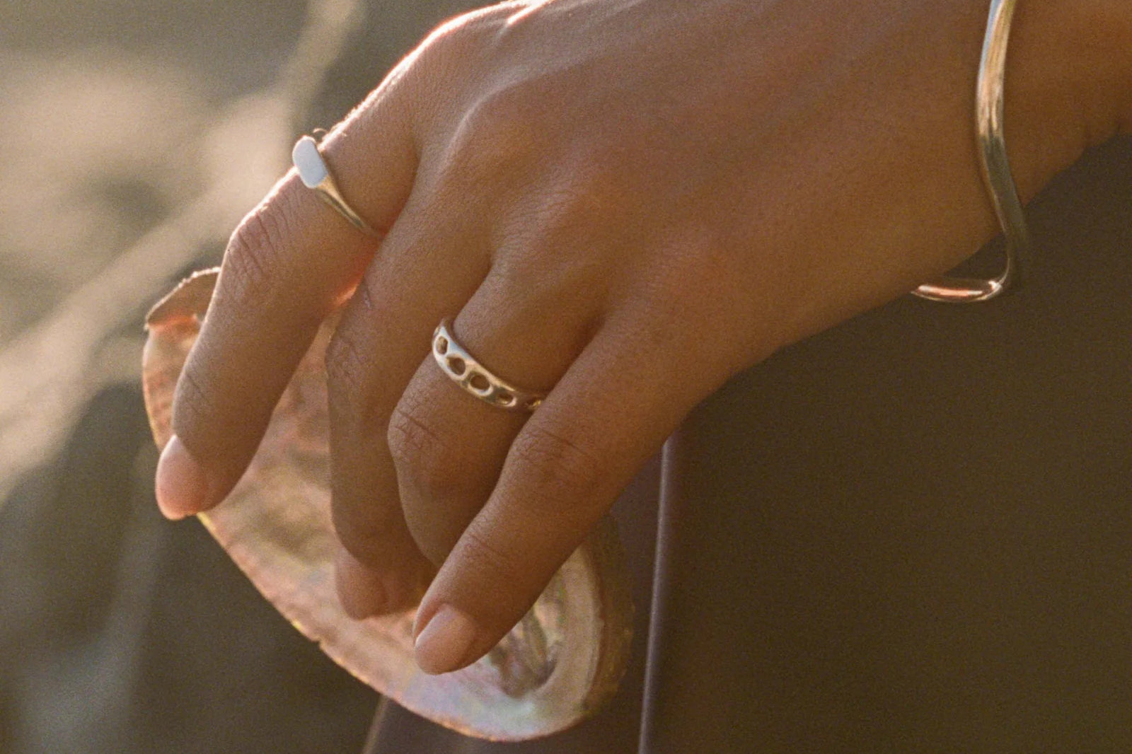 A note on brass rings: The copper in brass rings can react to your ph levels, body sweat, and lotions, causing the area where the ring rests on your finger to turn green. This is harmless and natural. You can apply clear nail polish on the inside to act as a barrier between the metal and your skin. Keep your hands clean, dry, and remove pieces when washing or applying products to keep your ring looking its best.